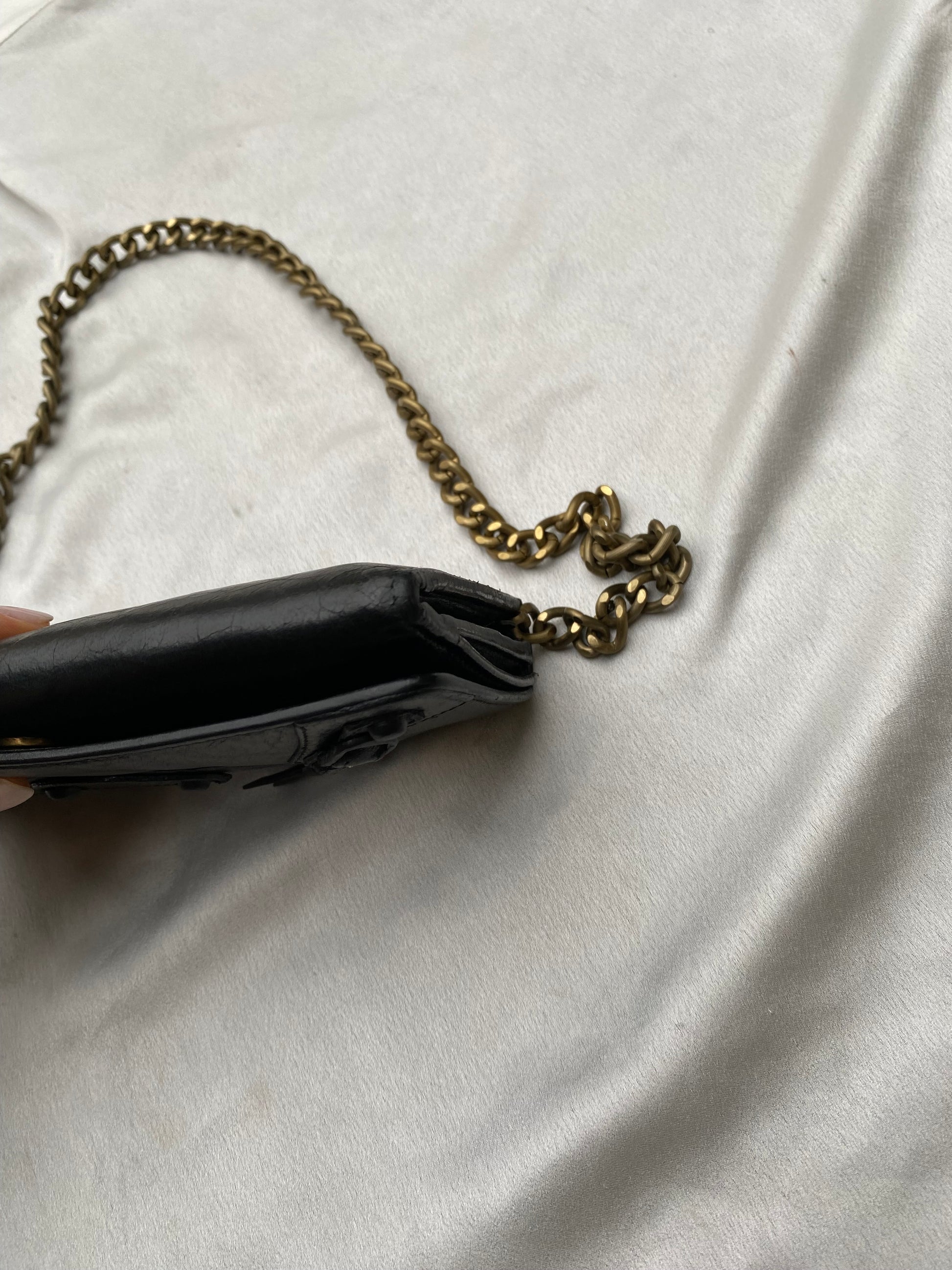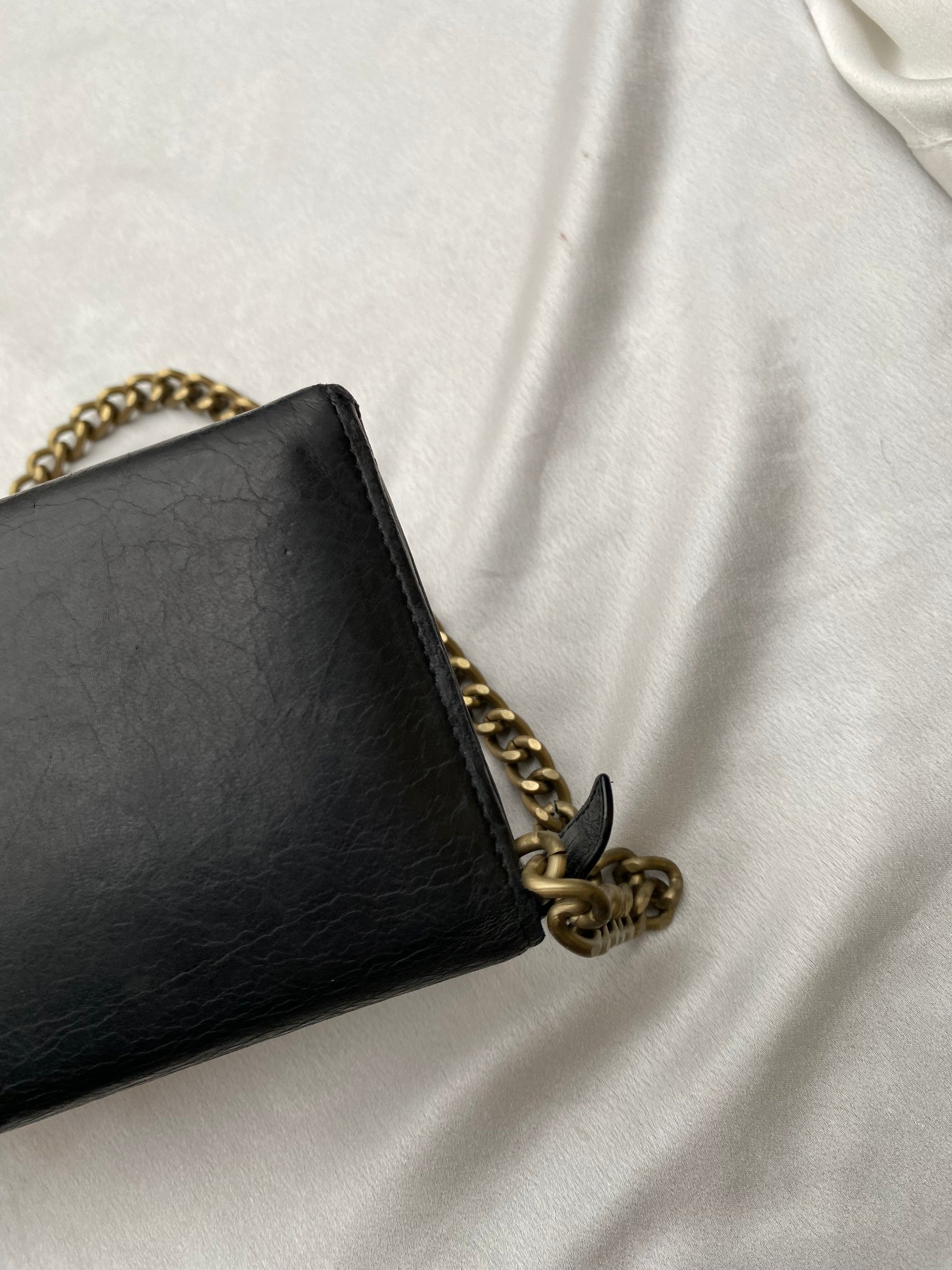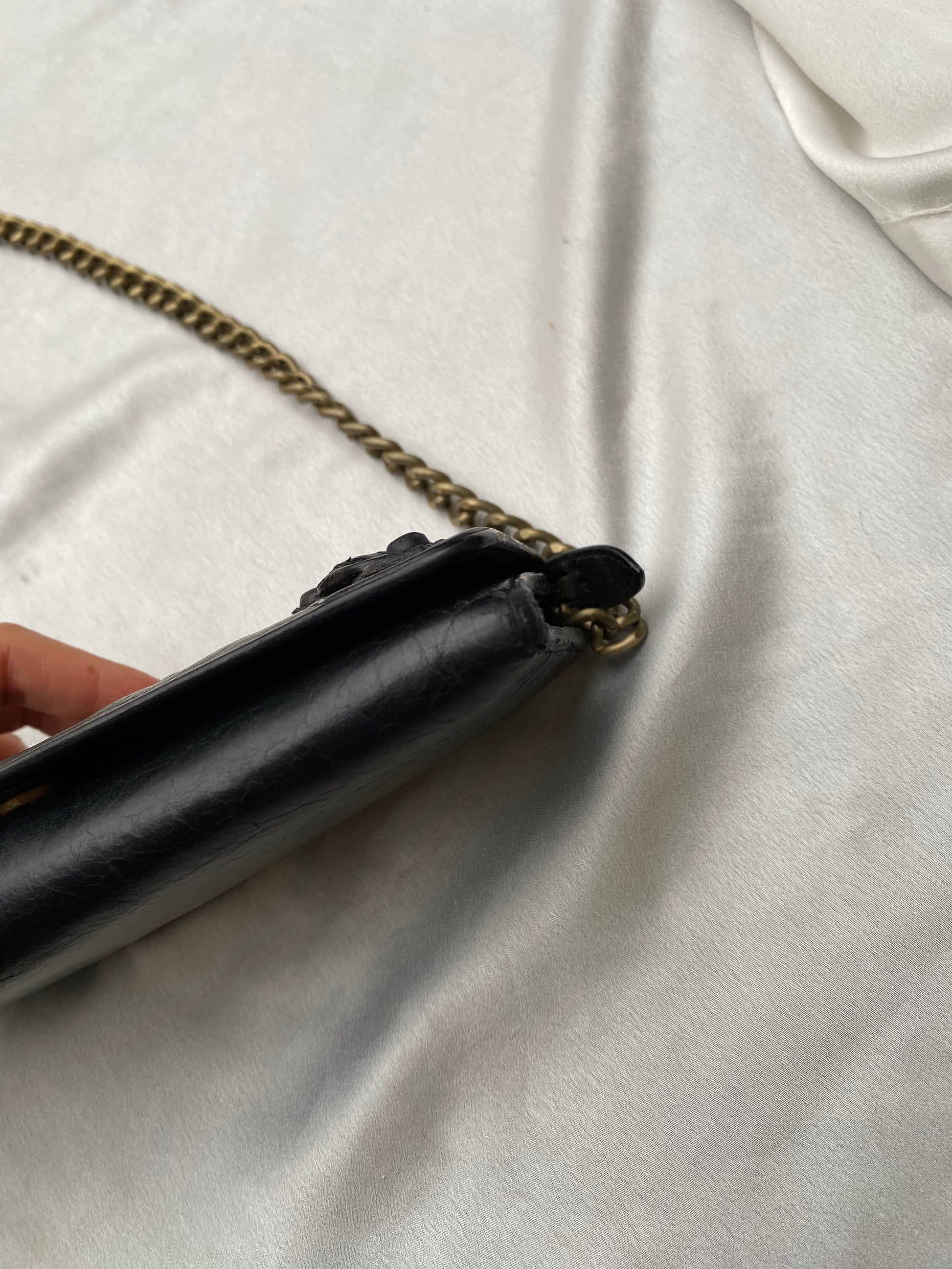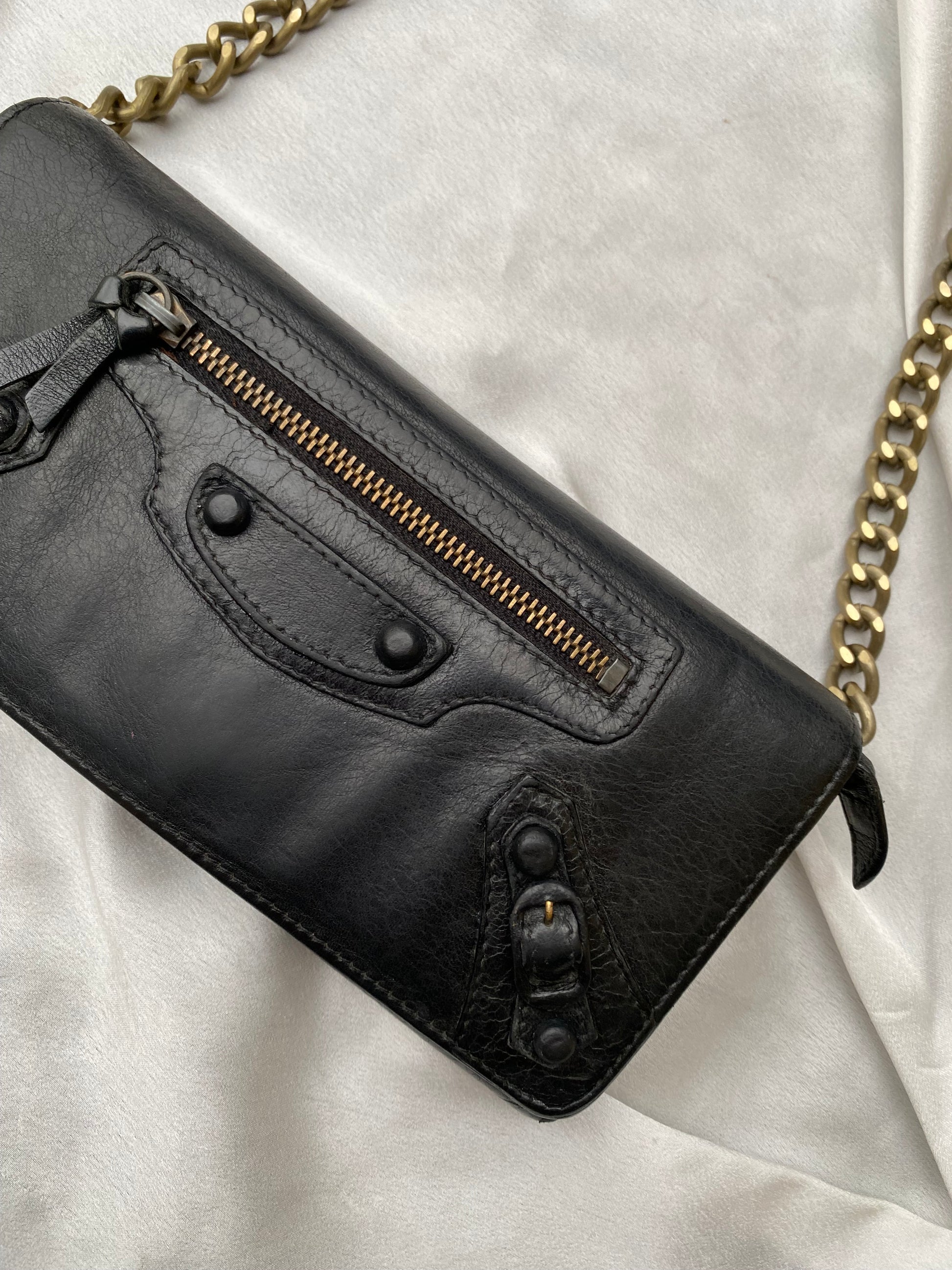 Black Balenciaga City WOC clutch/wallet with covered hardware. Added chain for shoulder carry. Fits an iPhone 15 Pro Max, plus cards and debit cards. Used, with some marks on the leather, but overall good condition.