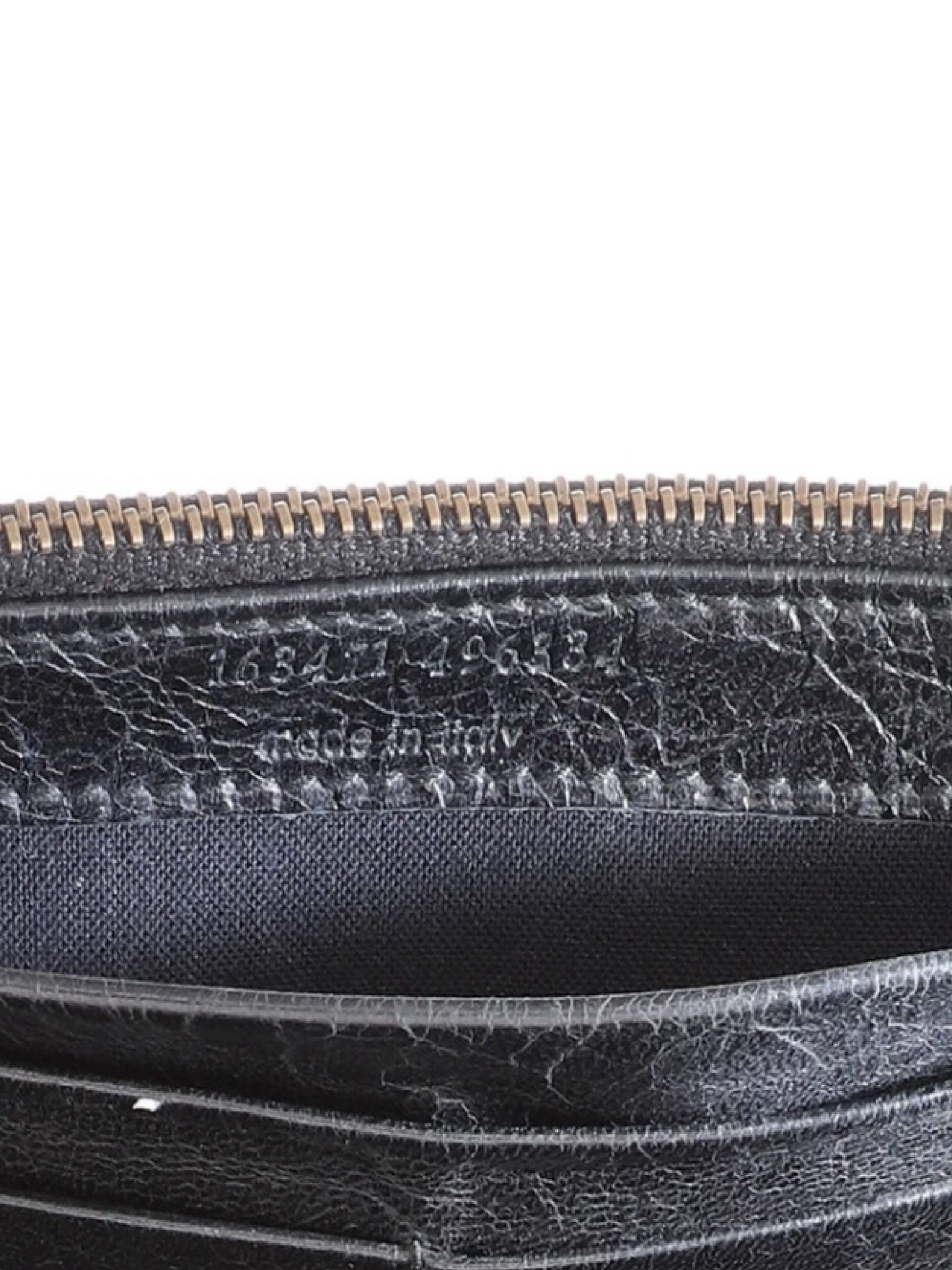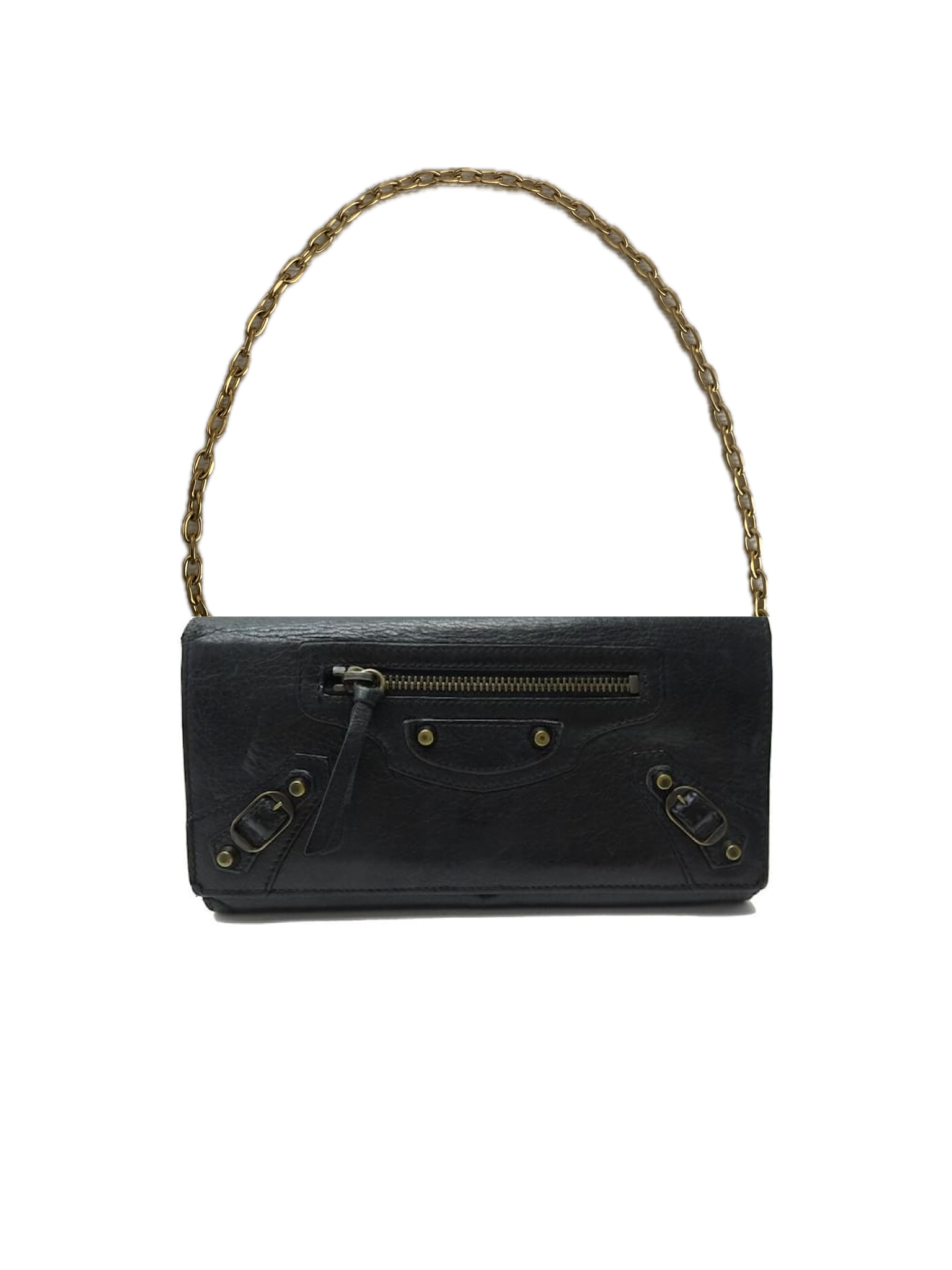 Balenciaga City Wallet on Chain in black. Classic brass hardware. Removable gold chain added for shoulder carry. Holds an iPhone 15 Pro Max, plus cards and banknotes. Super soft leather. Some irregularities on the edges, good overall condition.