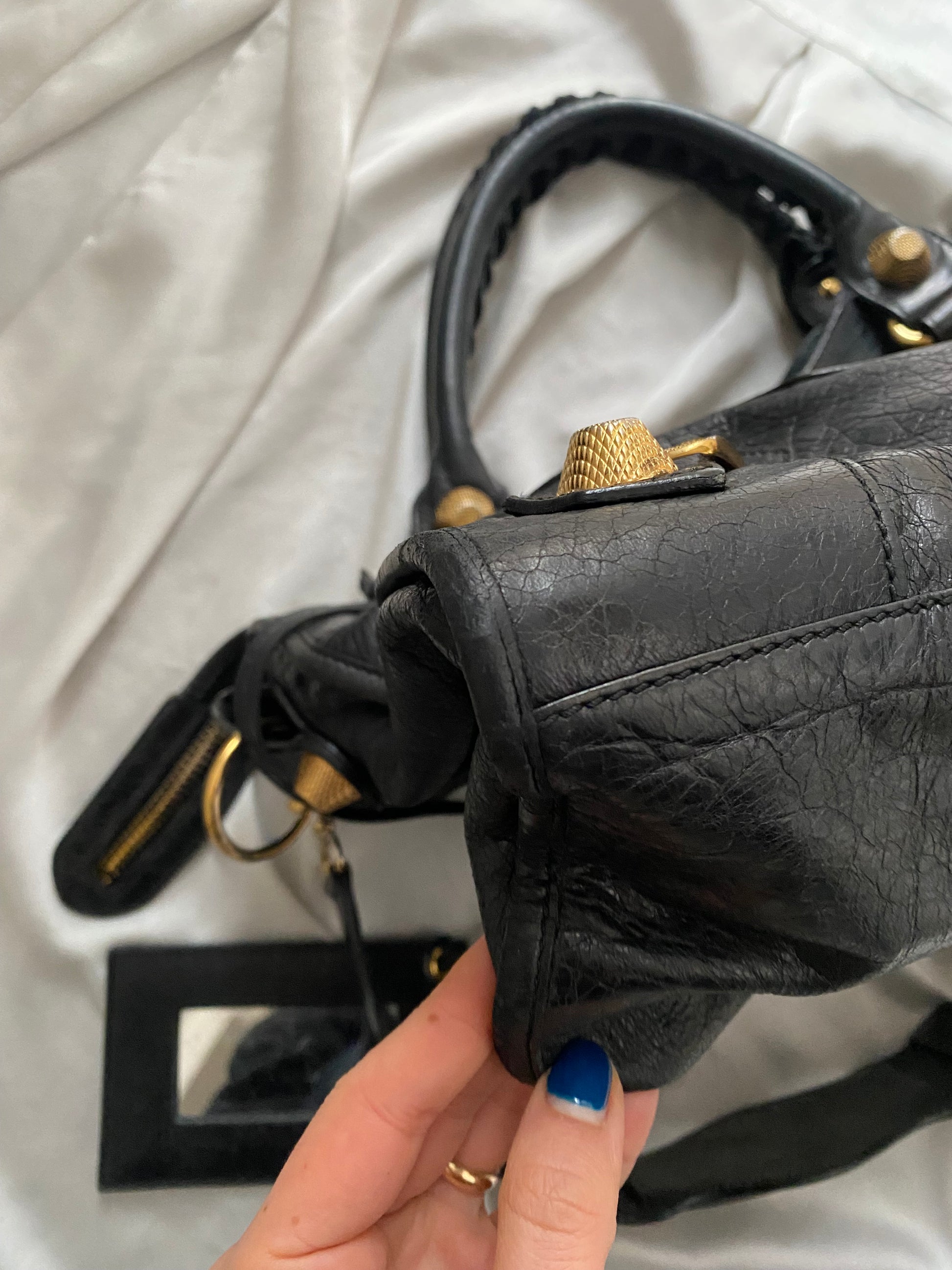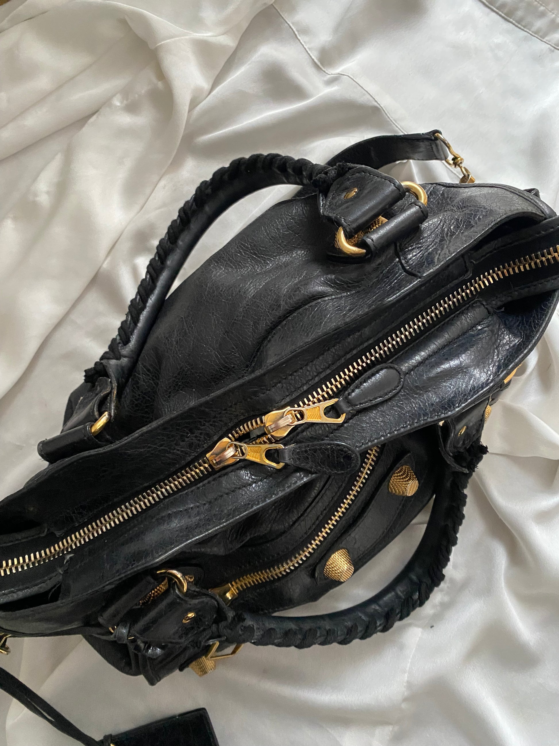 Iconic anthracite Balenciaga City bag with Giant 21 gold hardware. Refreshed color, new handle cord. Some marks on the leather, very good overall condition.