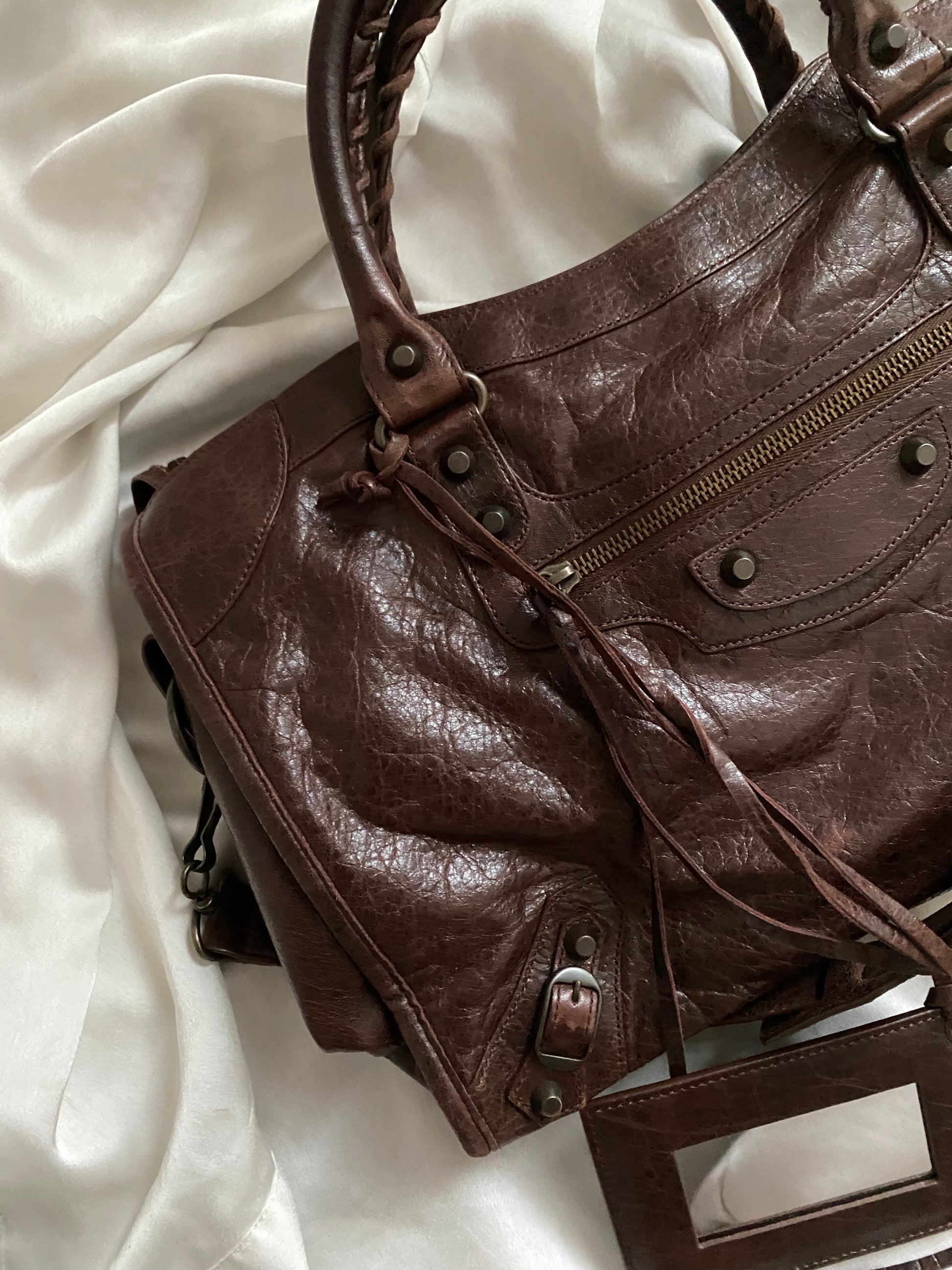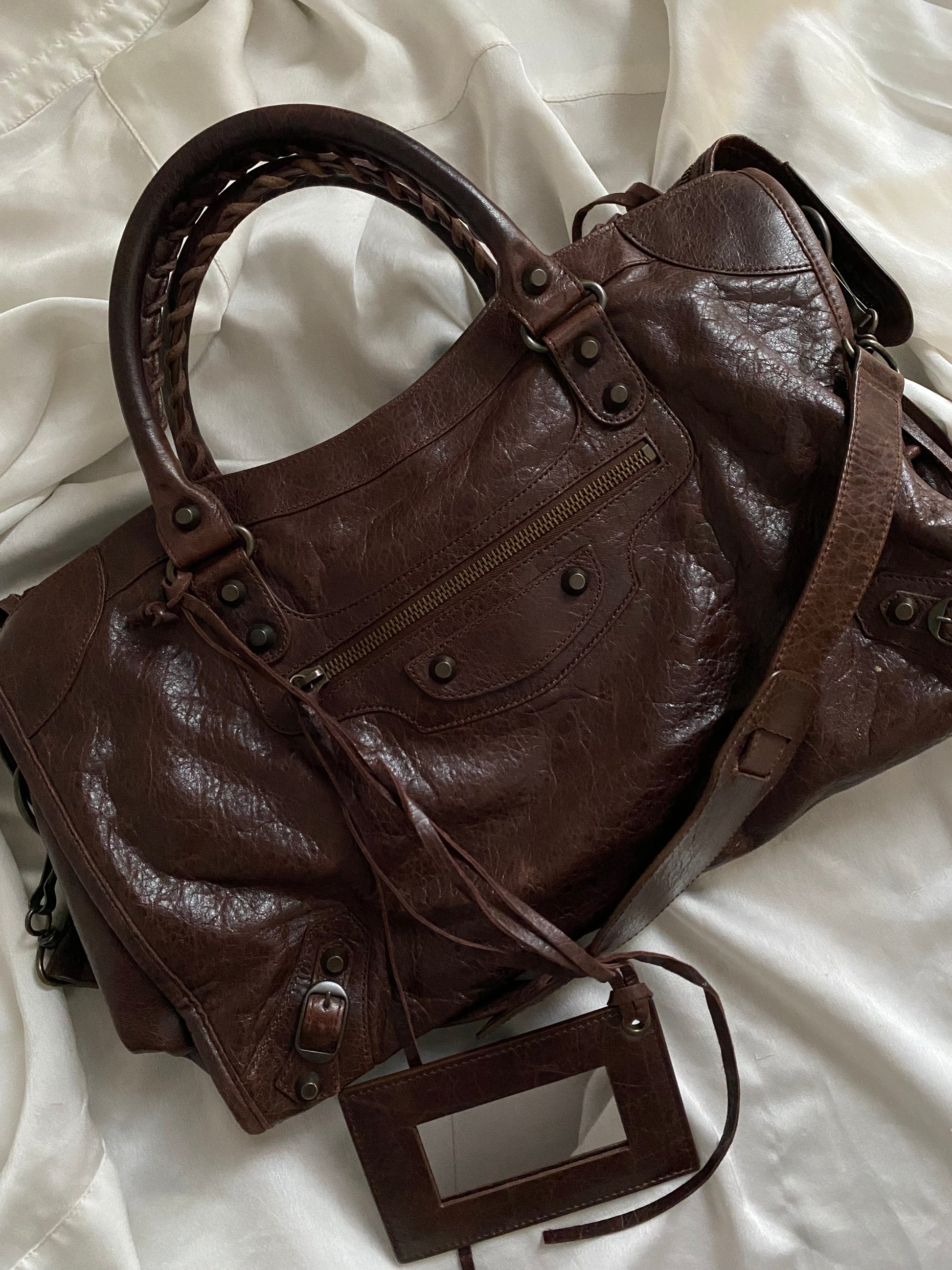 Iconica balenciaga city marrone color cigar fonce f/w 2013 in classic hardware 21 con frange. colore pazzesco. Nuova con ancora la pellicola sulla metal tag interna.