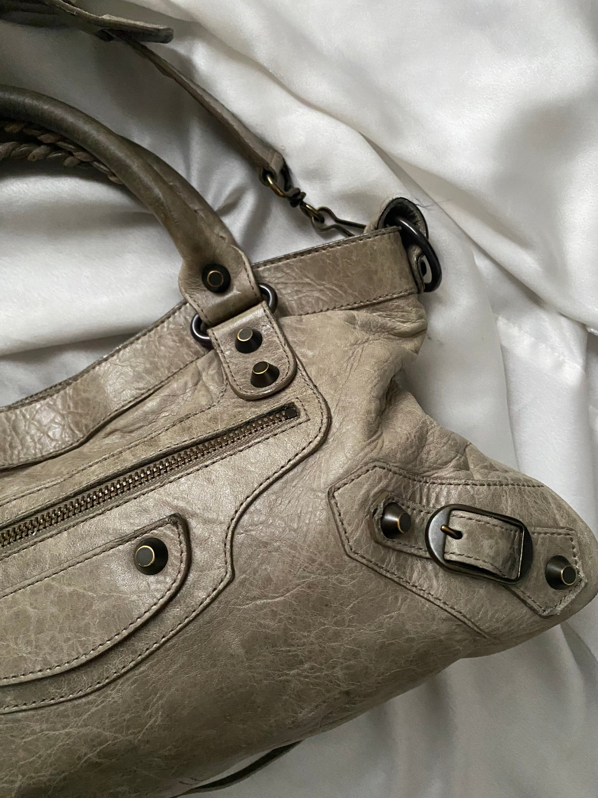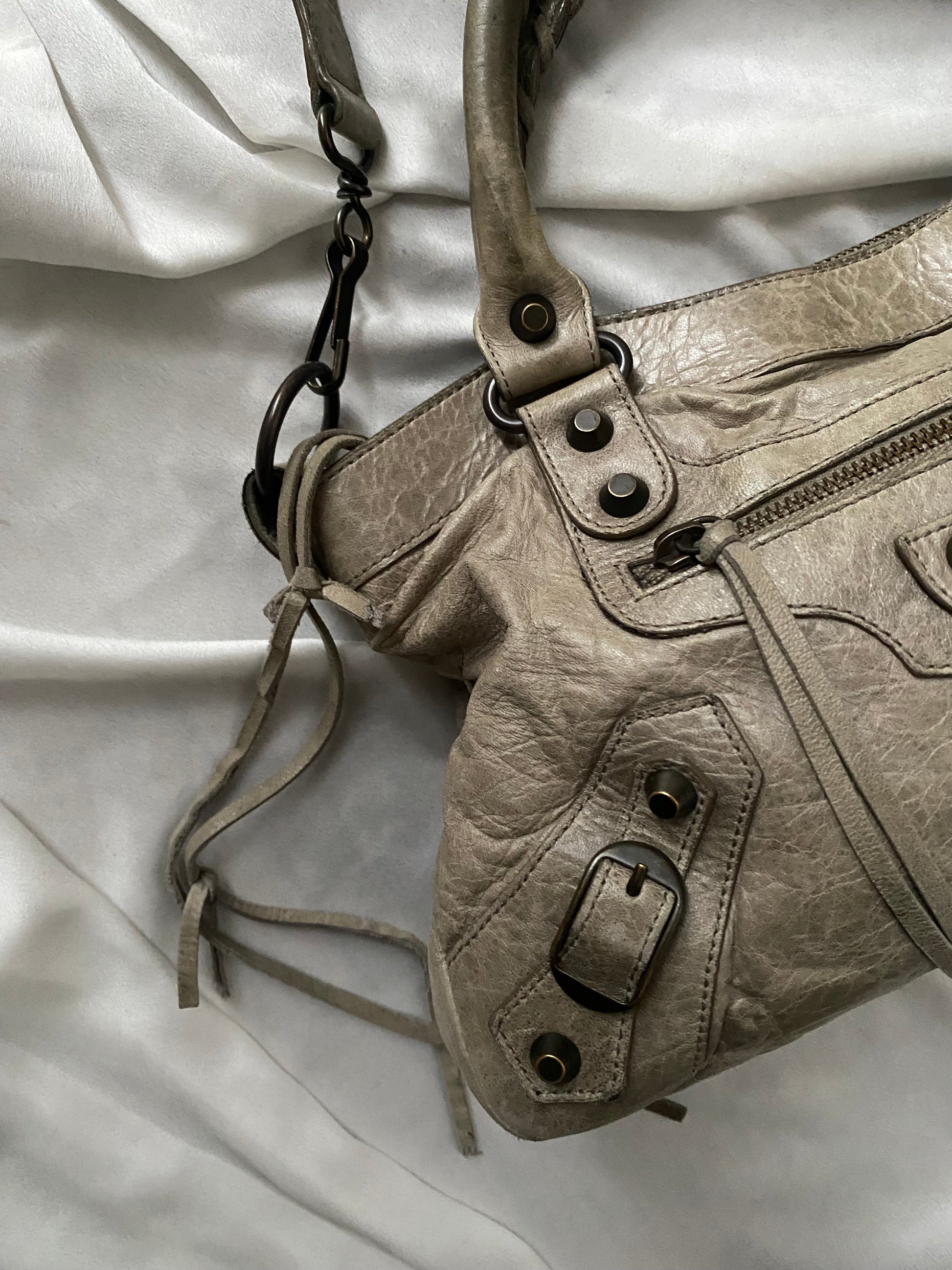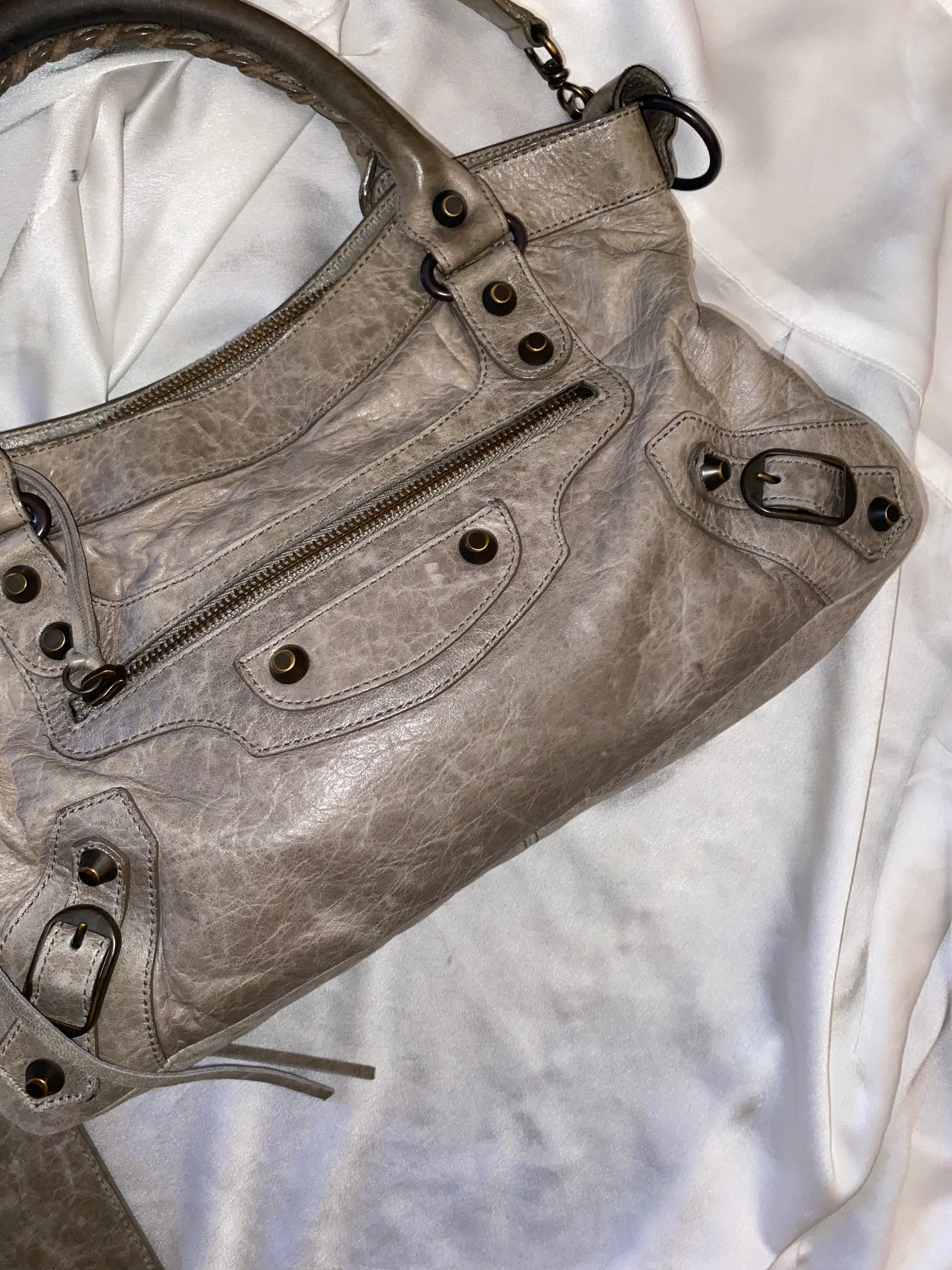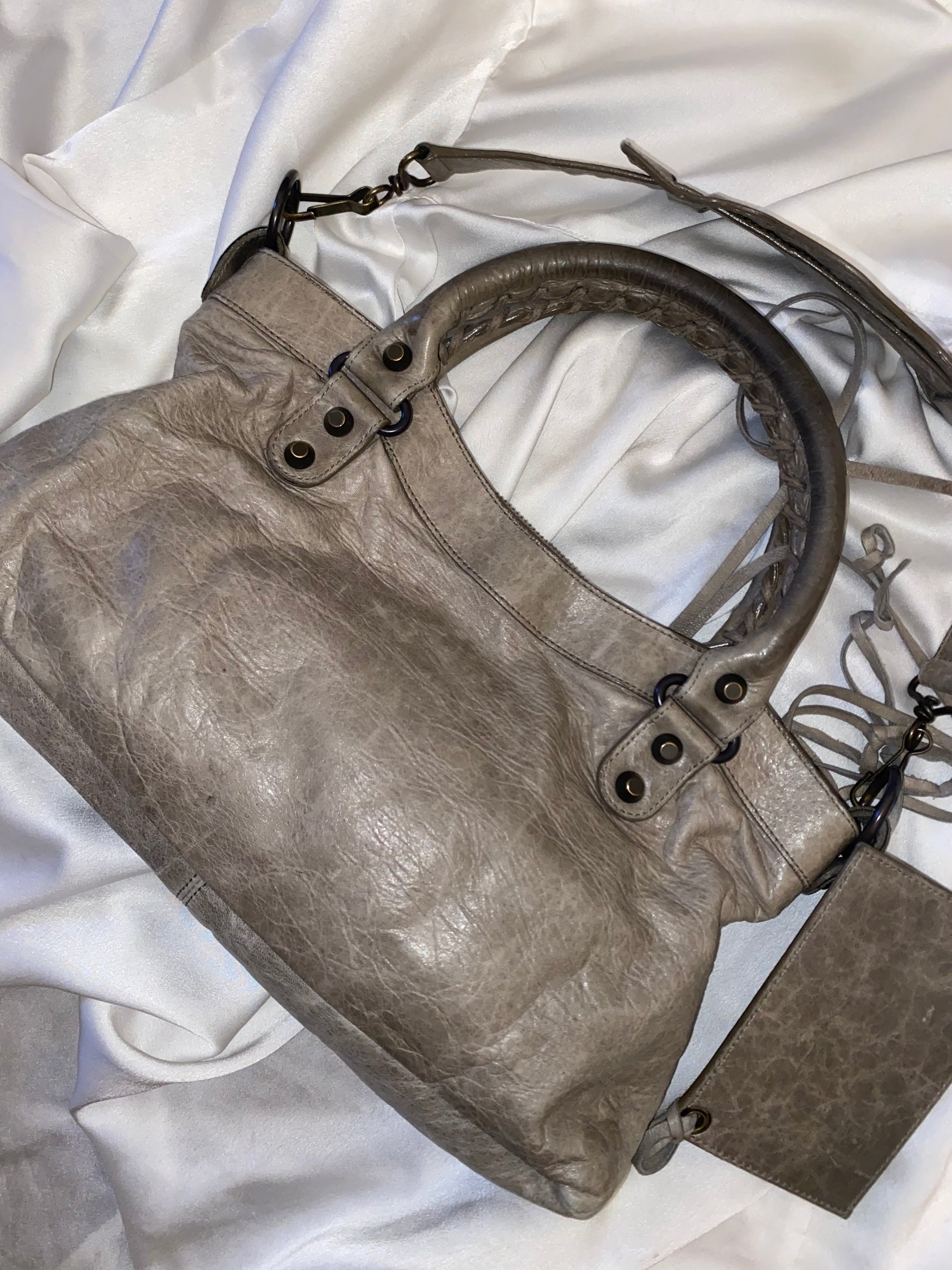 Balenciaga first color galet (rock) f/w 2009. Characteristic aged leather. Some marks on the leather and slightly darker handles. Amazing.