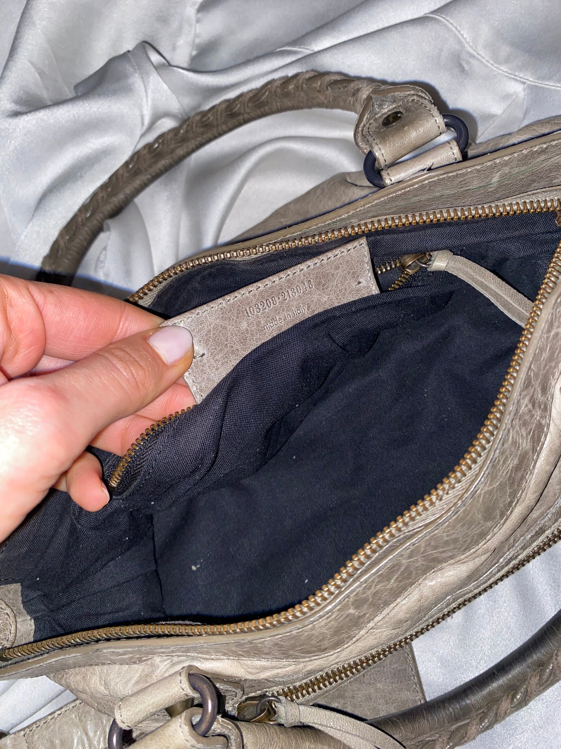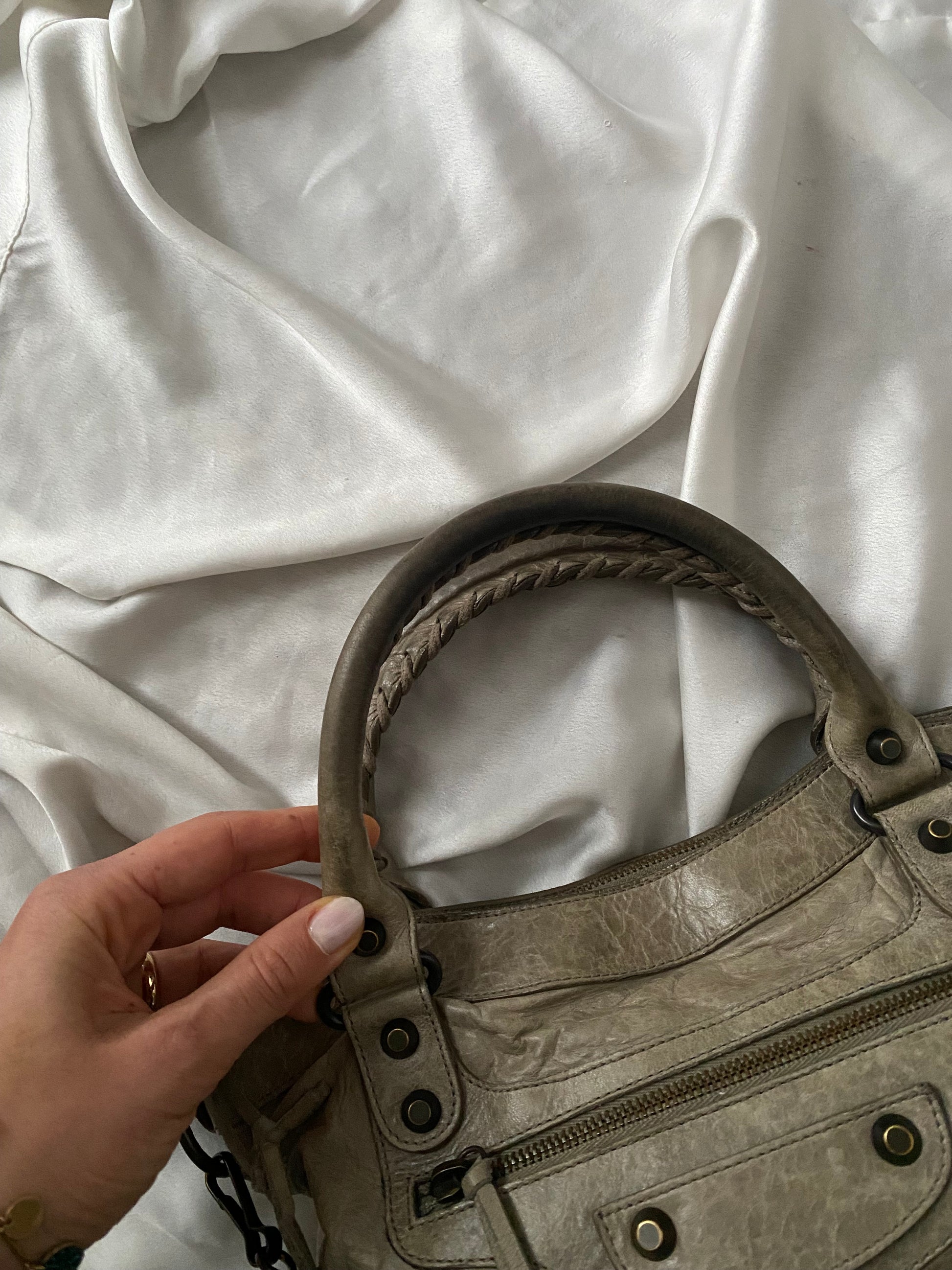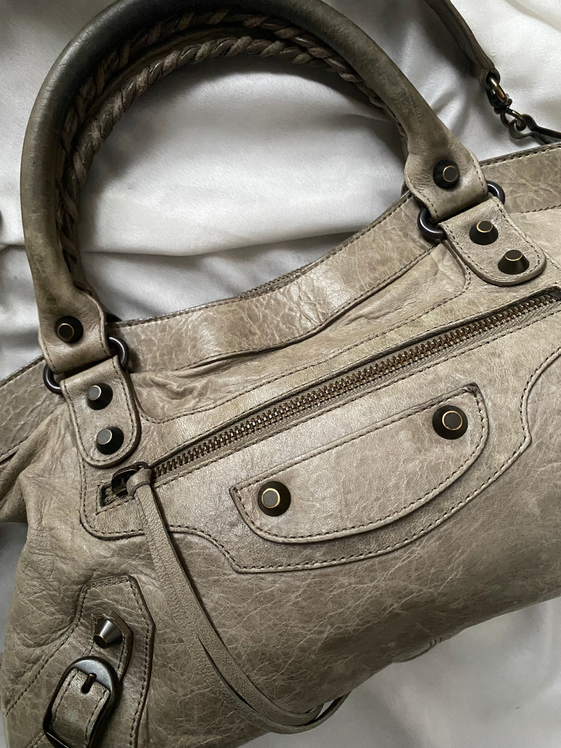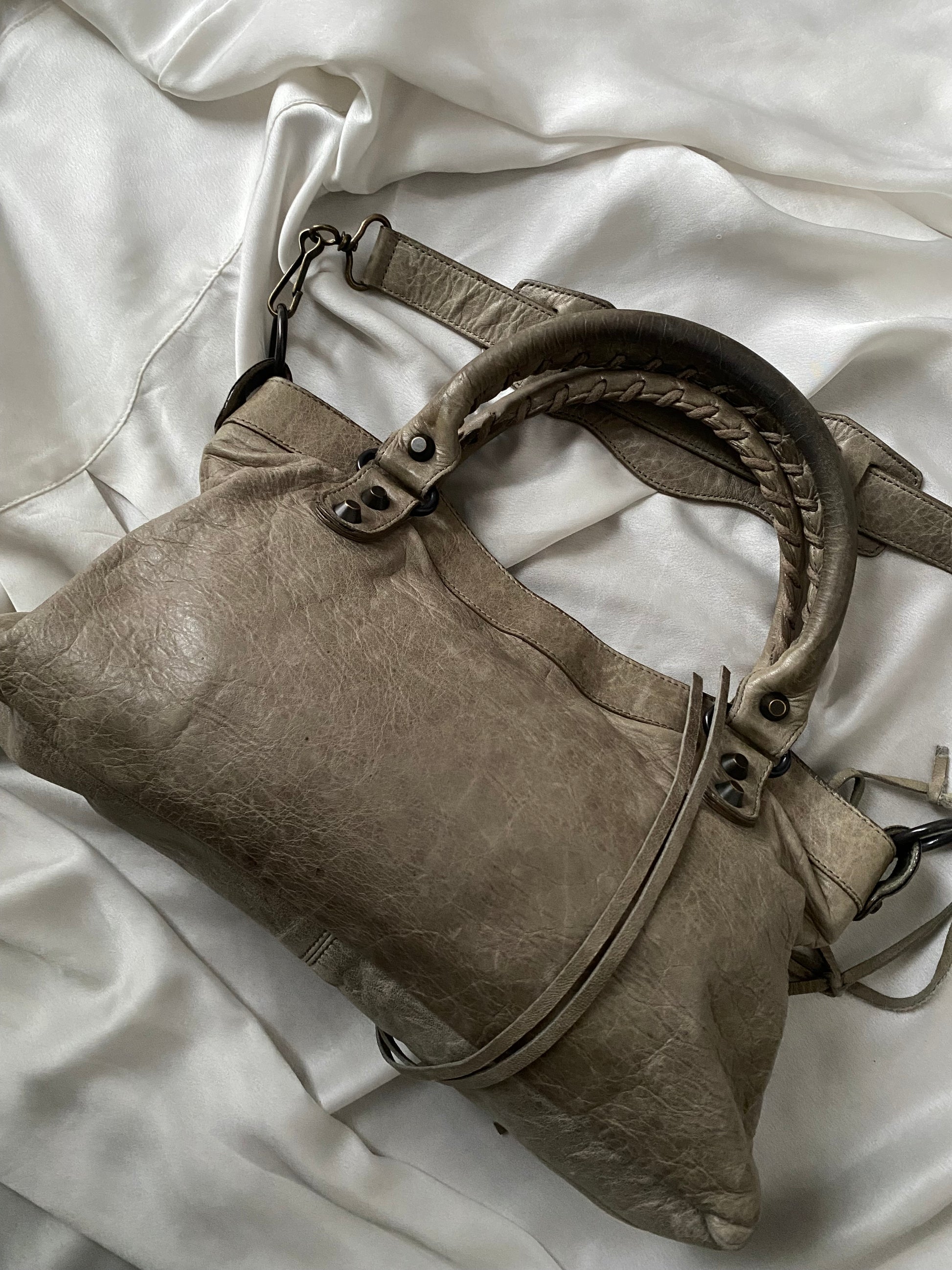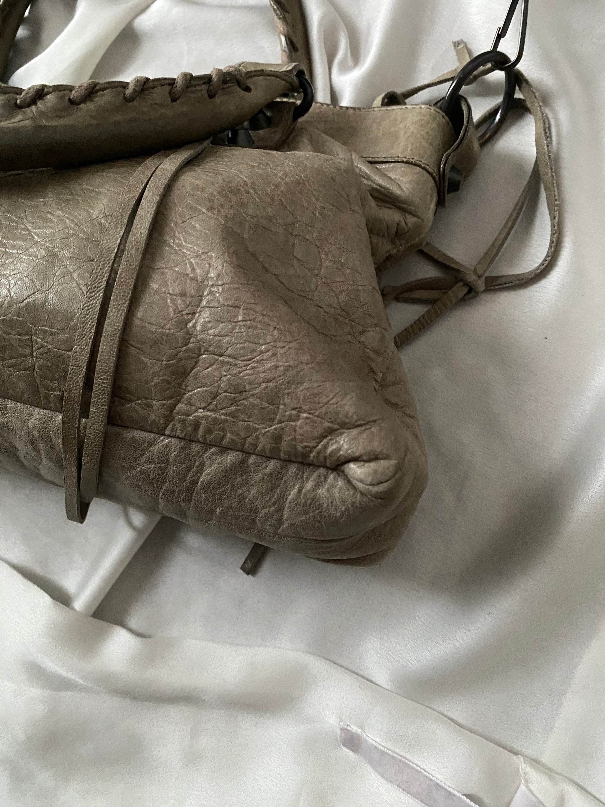Balenciaga first color galet (rock) f/w 2009. Characteristic aged leather. Some marks on the leather and slightly darker handles. Amazing.
