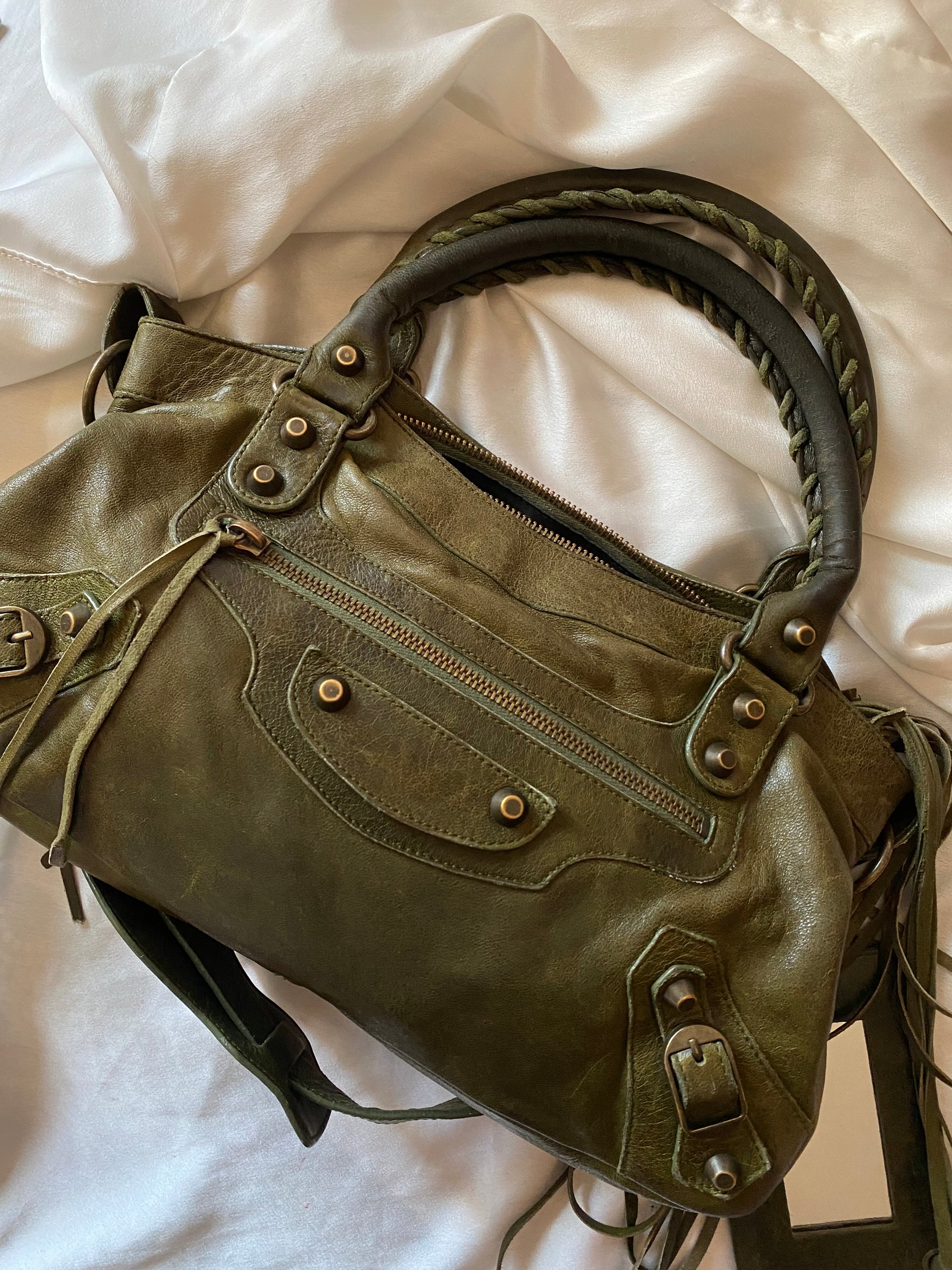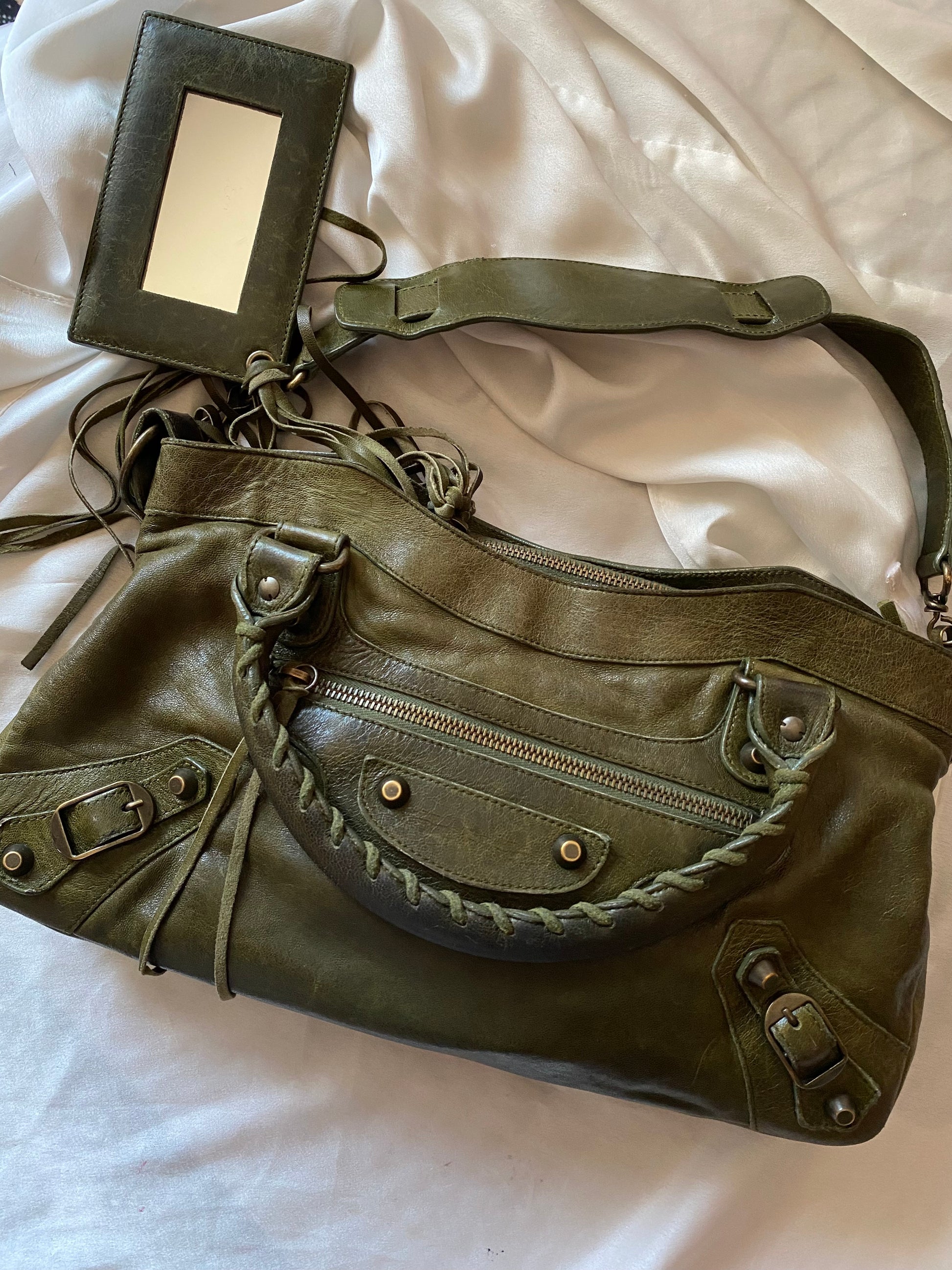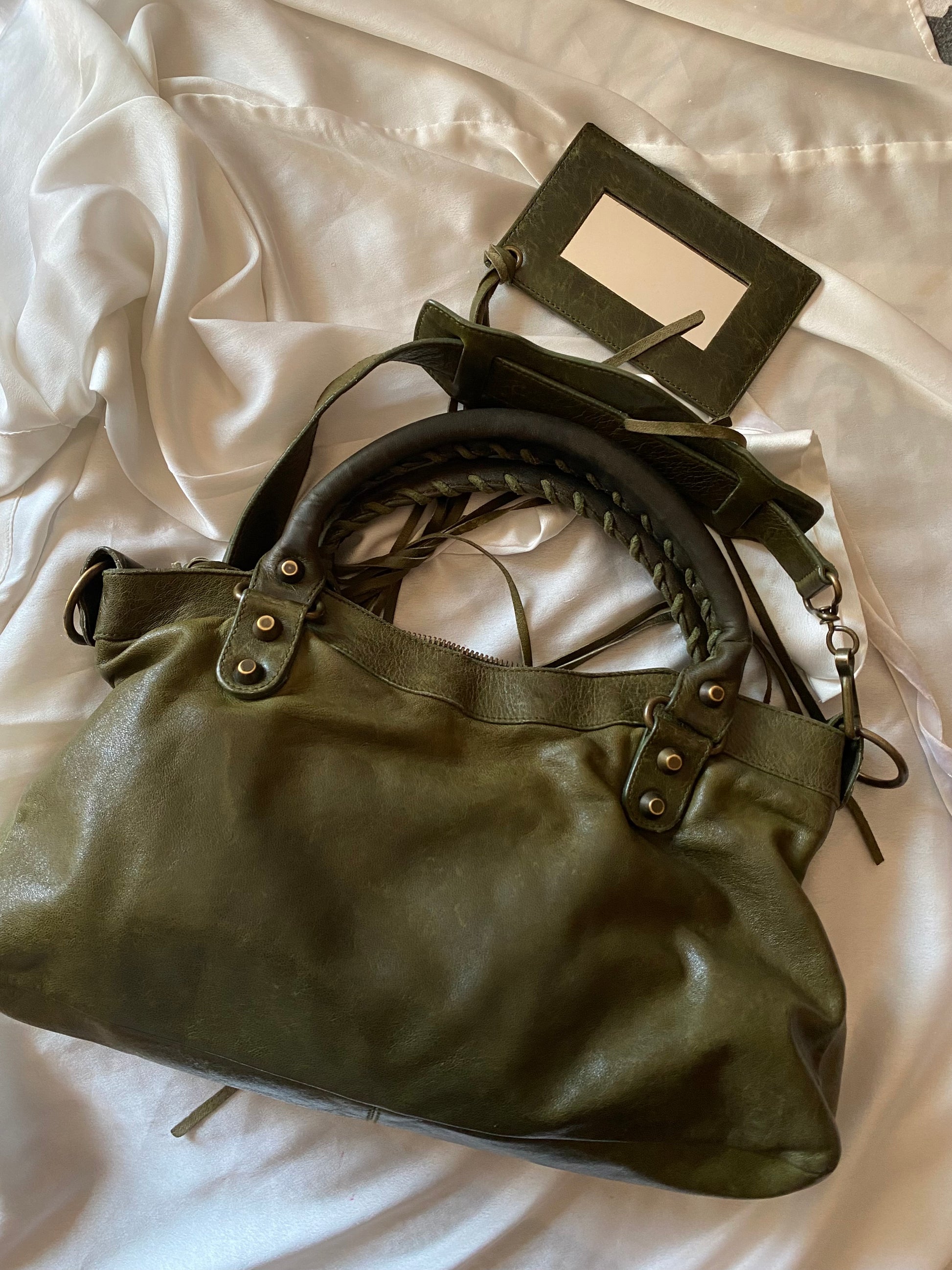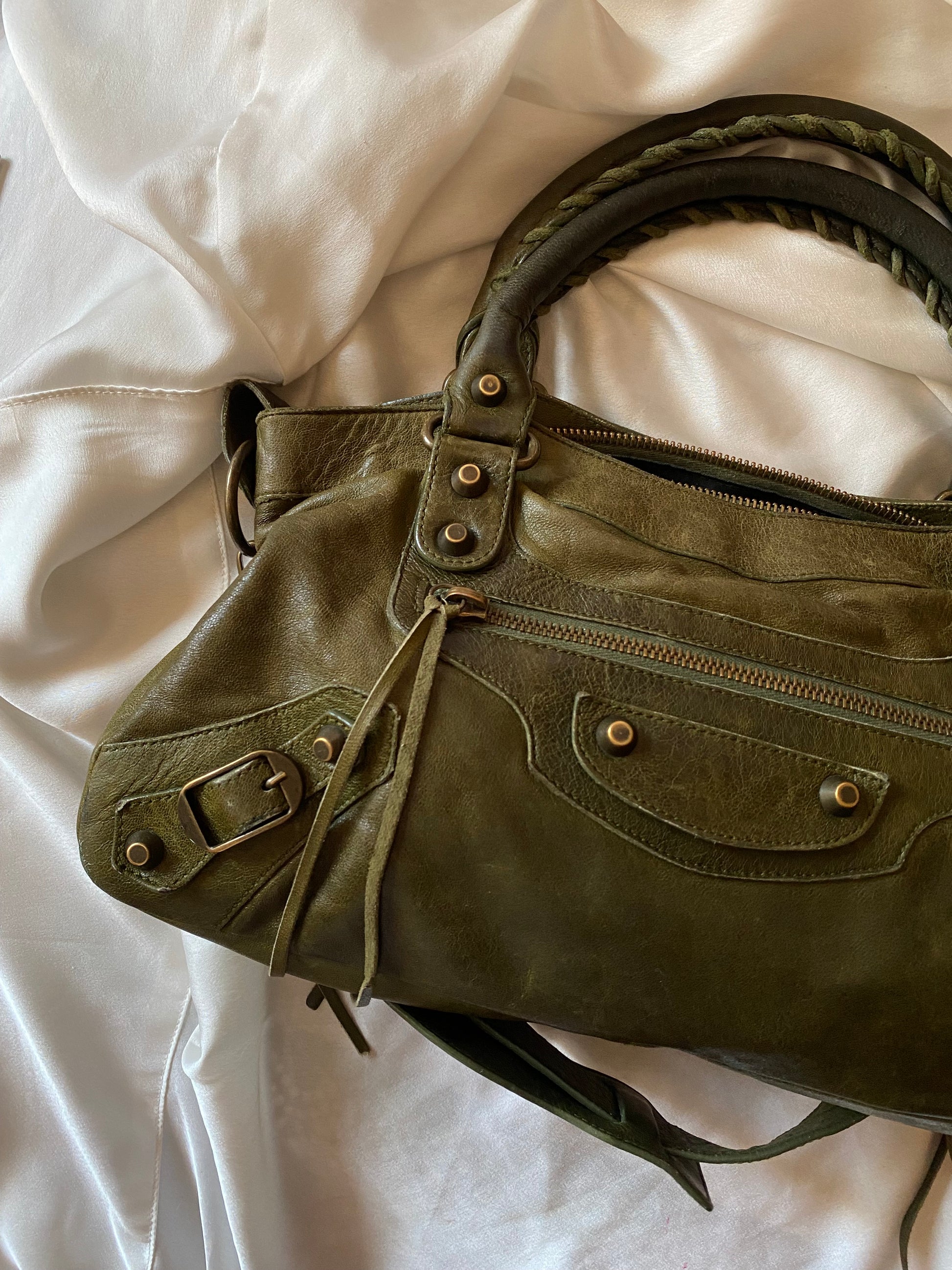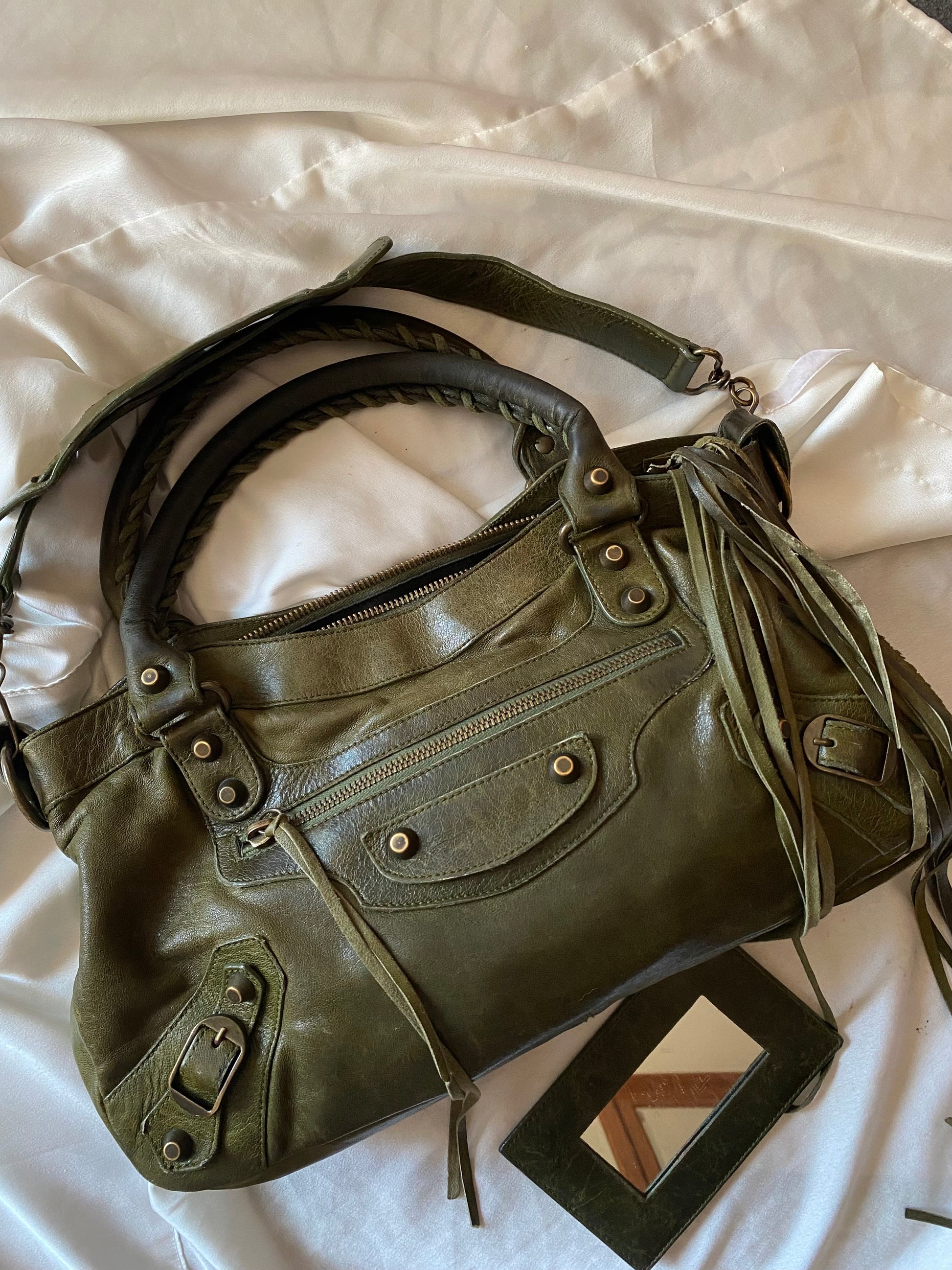 Wonderful Balenciaga First olive color from FW 2005 in chevre leather and genuine 925 silver tag 🥹 Truly wonderful color. Very soft leather. Minimal marks on the corners and slightly darker handles.