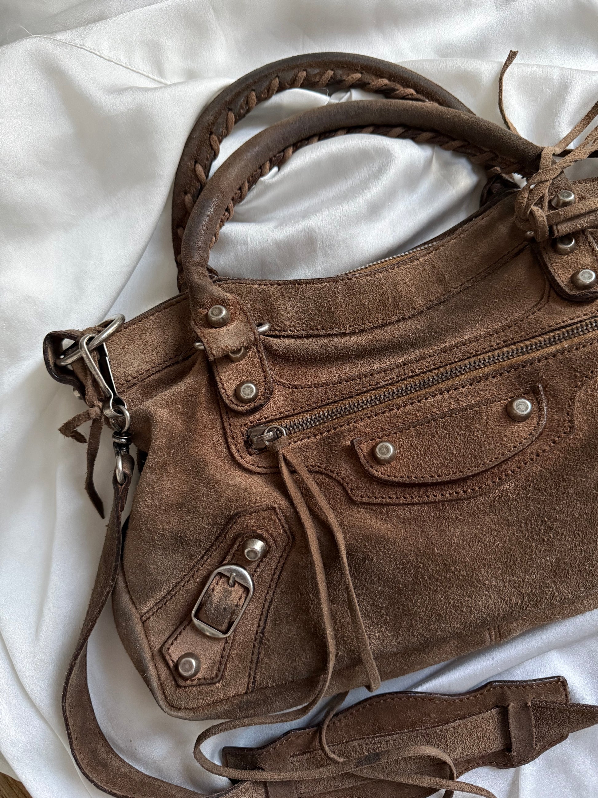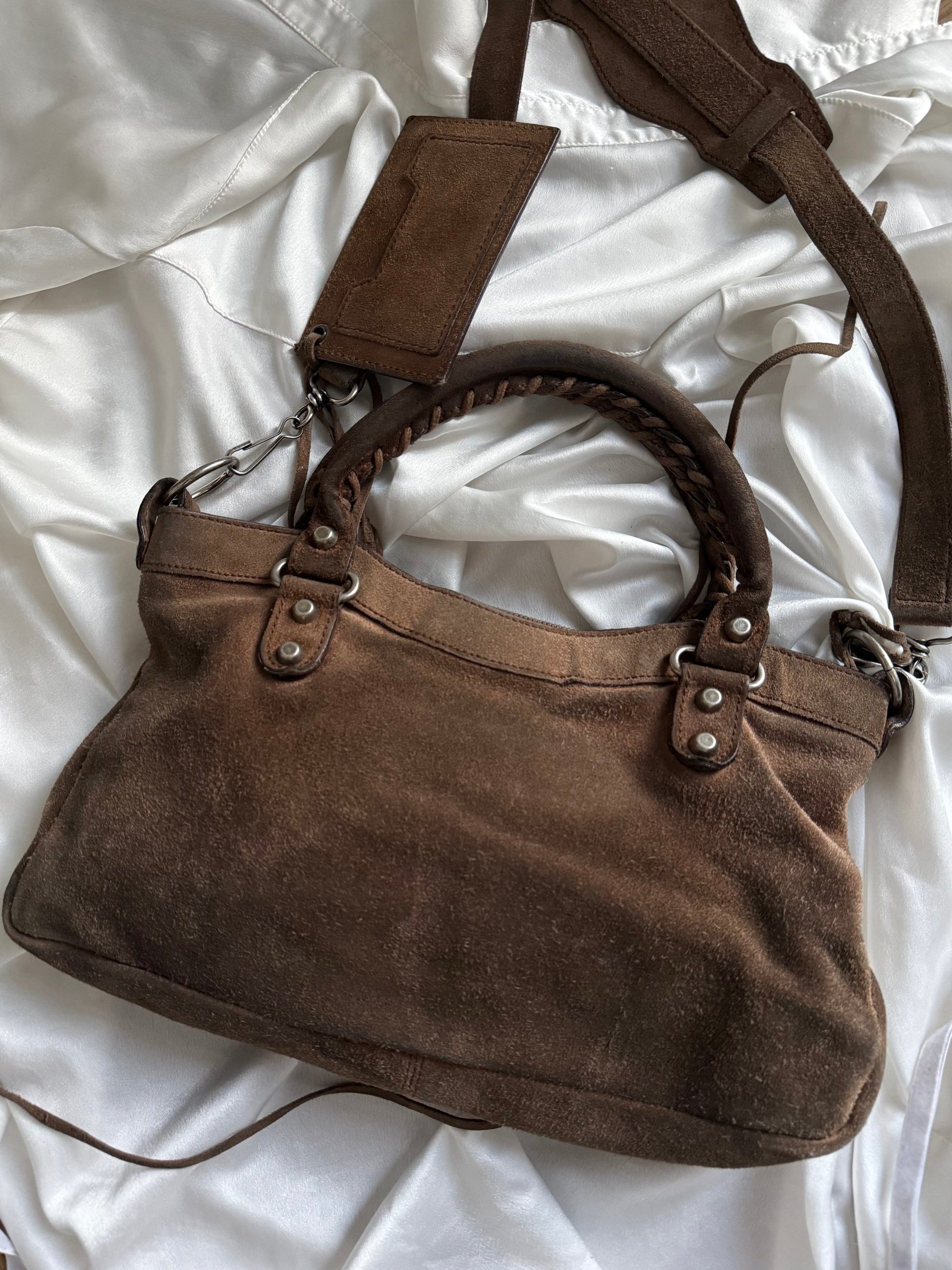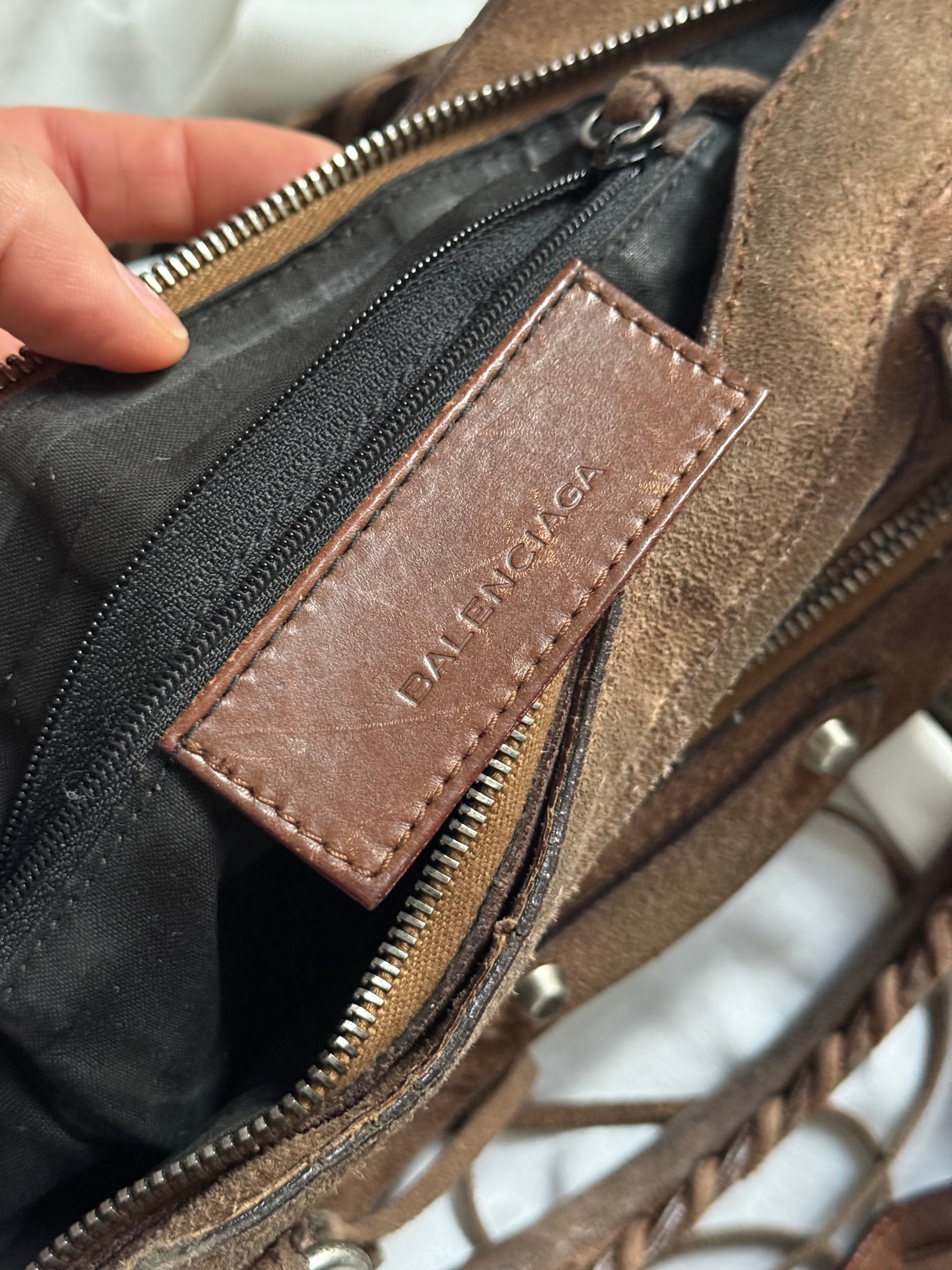 Balenciaga first rarissima in pelle scamosciata. Pezzo rarissimo da collezione del 2002, con l’introvabile pewter hardware. Usata, con qualche segno sulla pelle e sui manici.