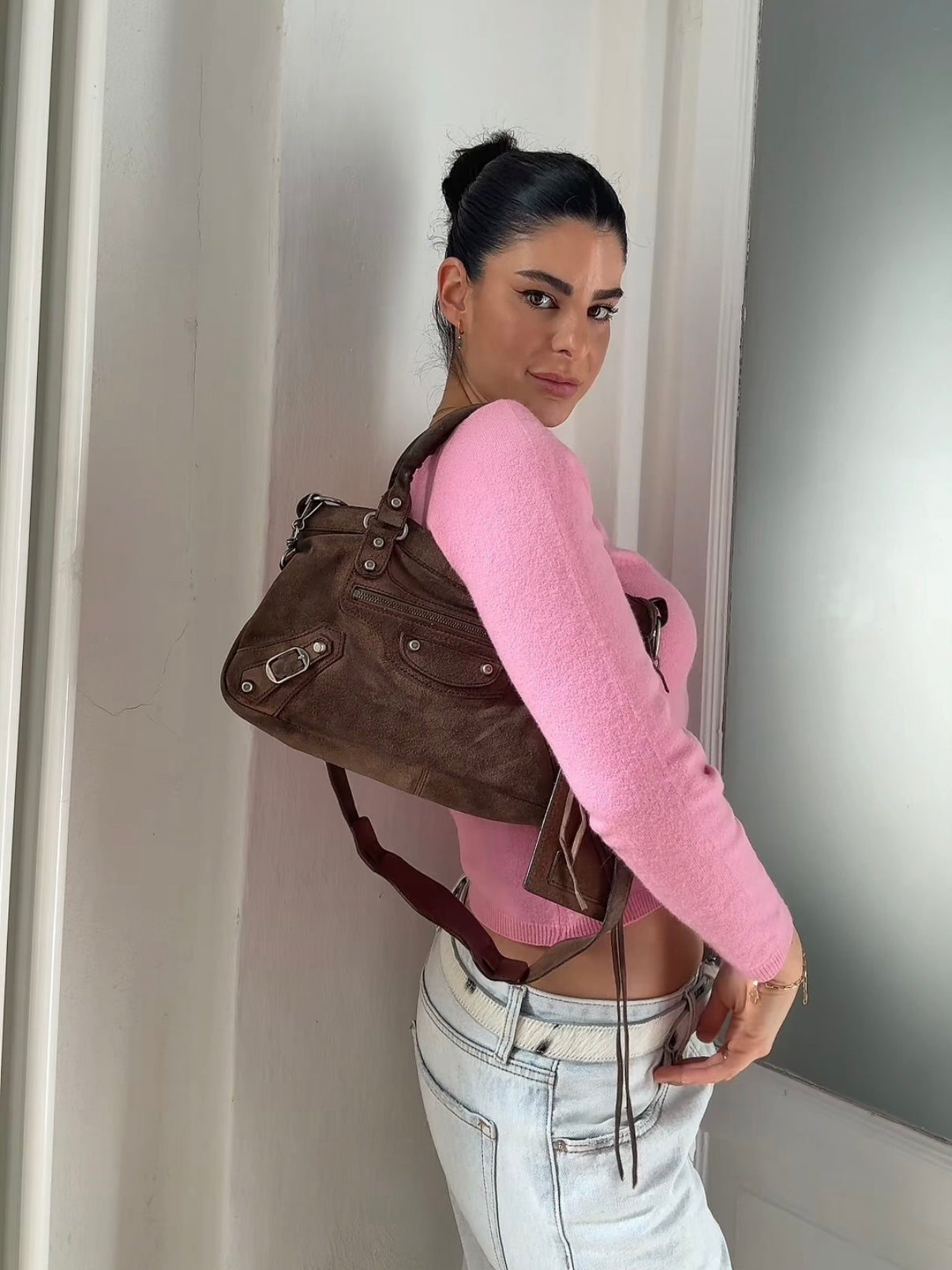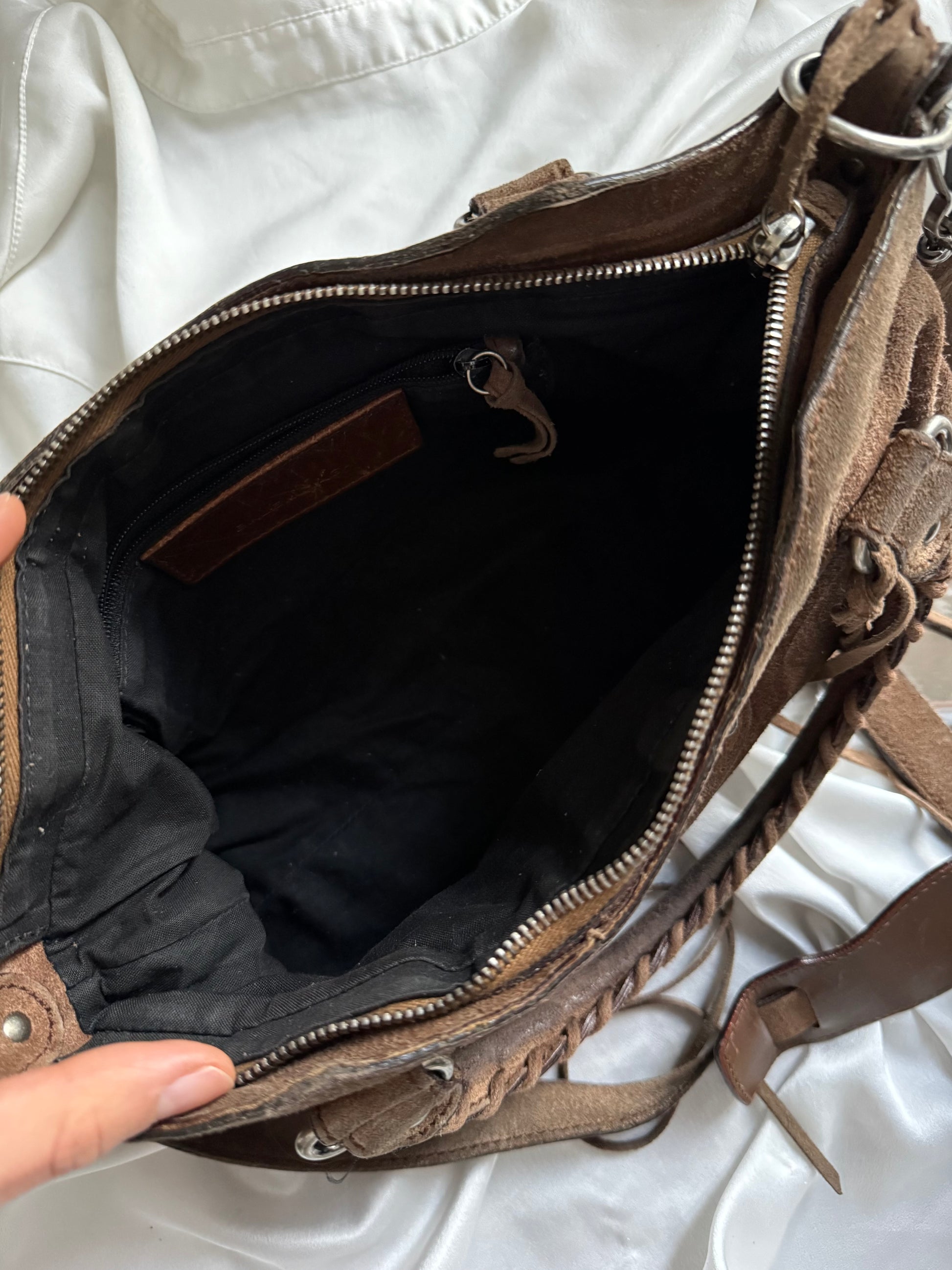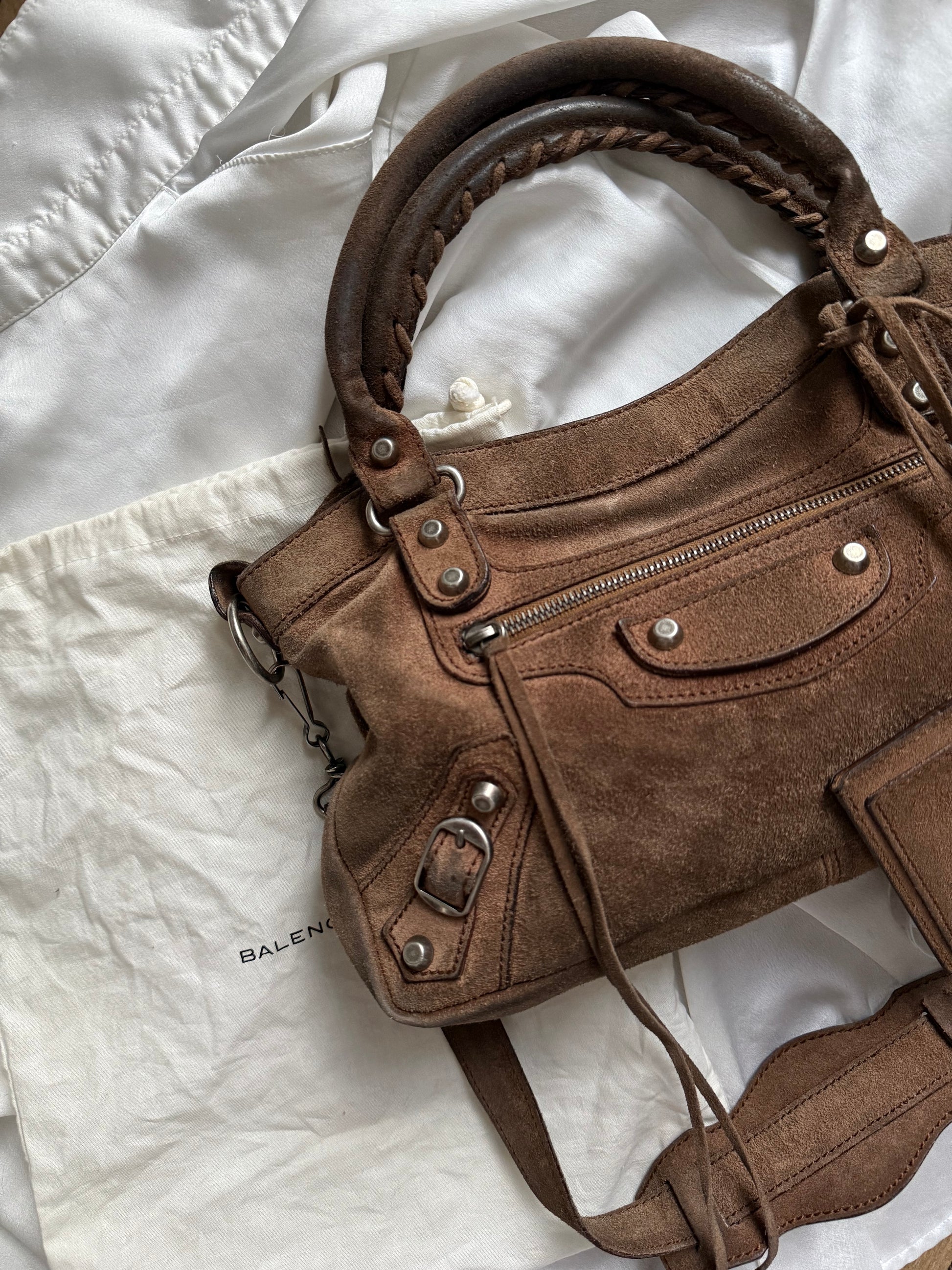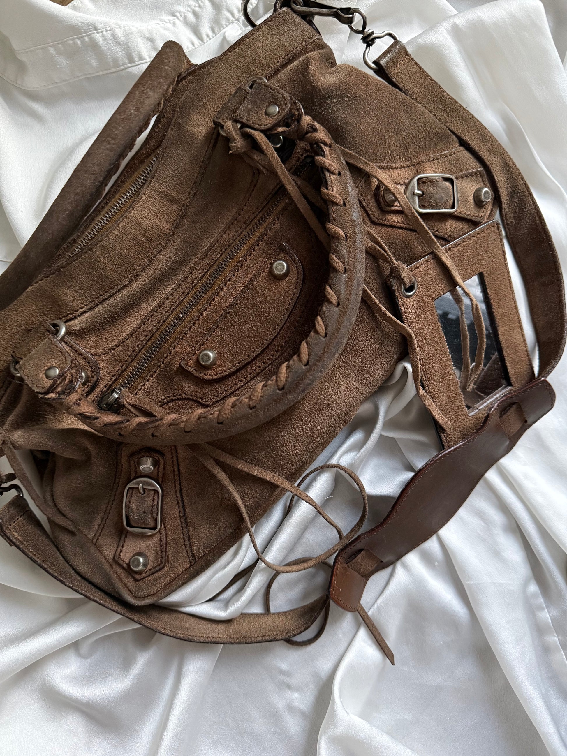 Balenciaga first rarissima in pelle scamosciata. Pezzo rarissimo da collezione del 2002, con l’introvabile pewter hardware. Usata, con qualche segno sulla pelle e sui manici.