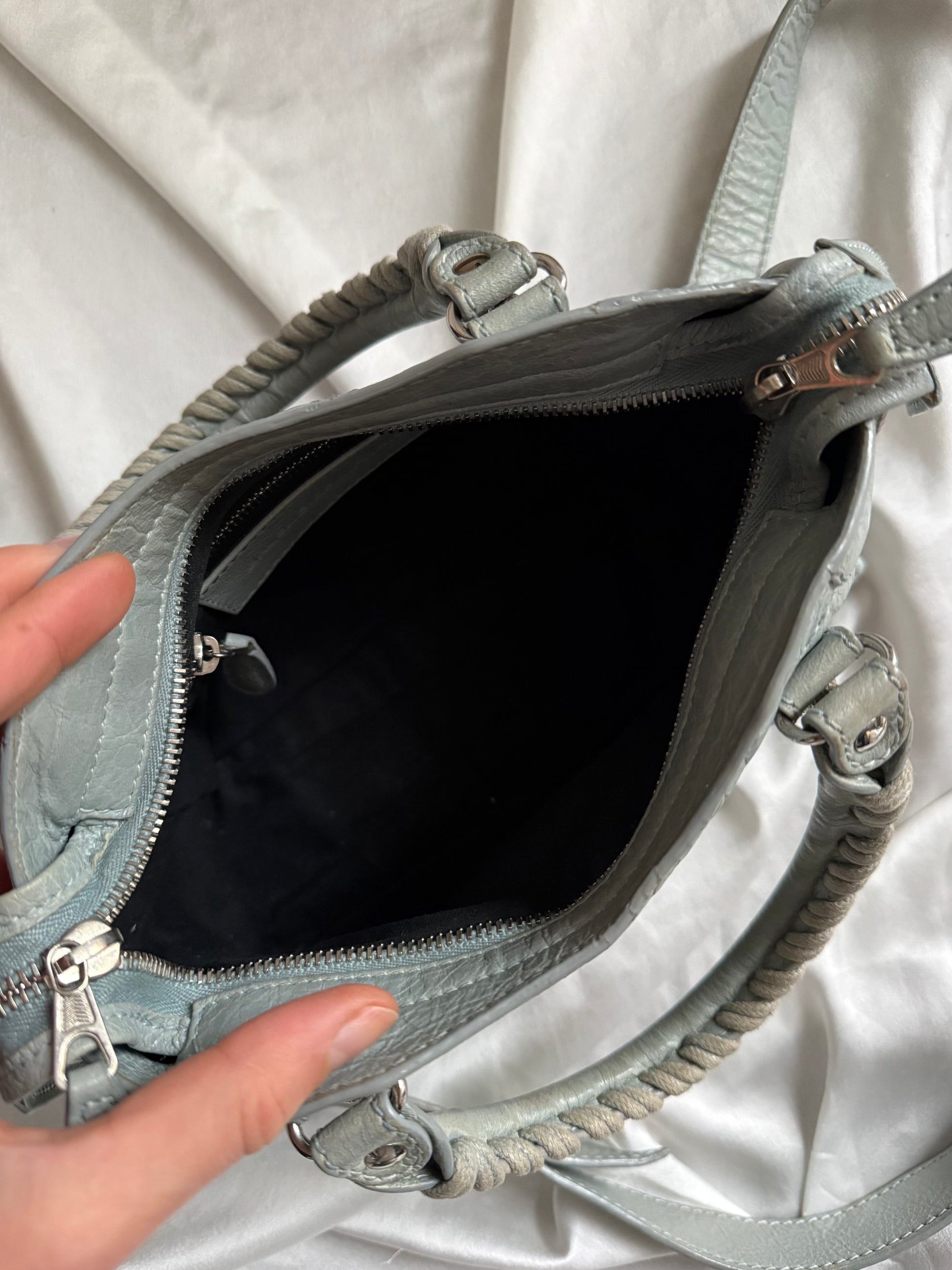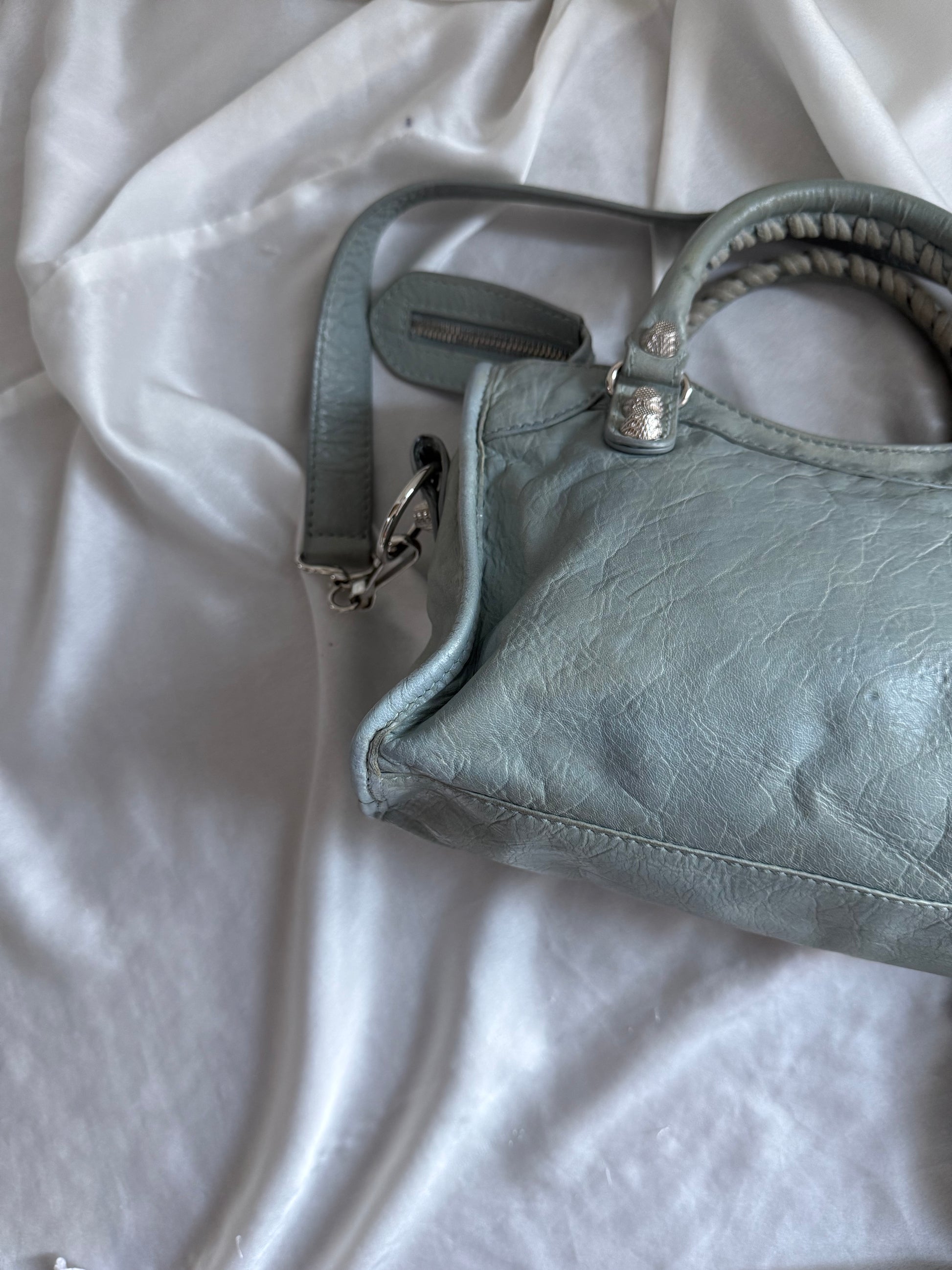 balenciaga mini city dello s/s 2013 in pelle d’agnello grigia-azzurrina (colore bleu acier) in giant hardware 12 gold. Usata con qualche segnetto sui manici. Pelle luminosa. Hardware lucente. Buone condizioni generali!