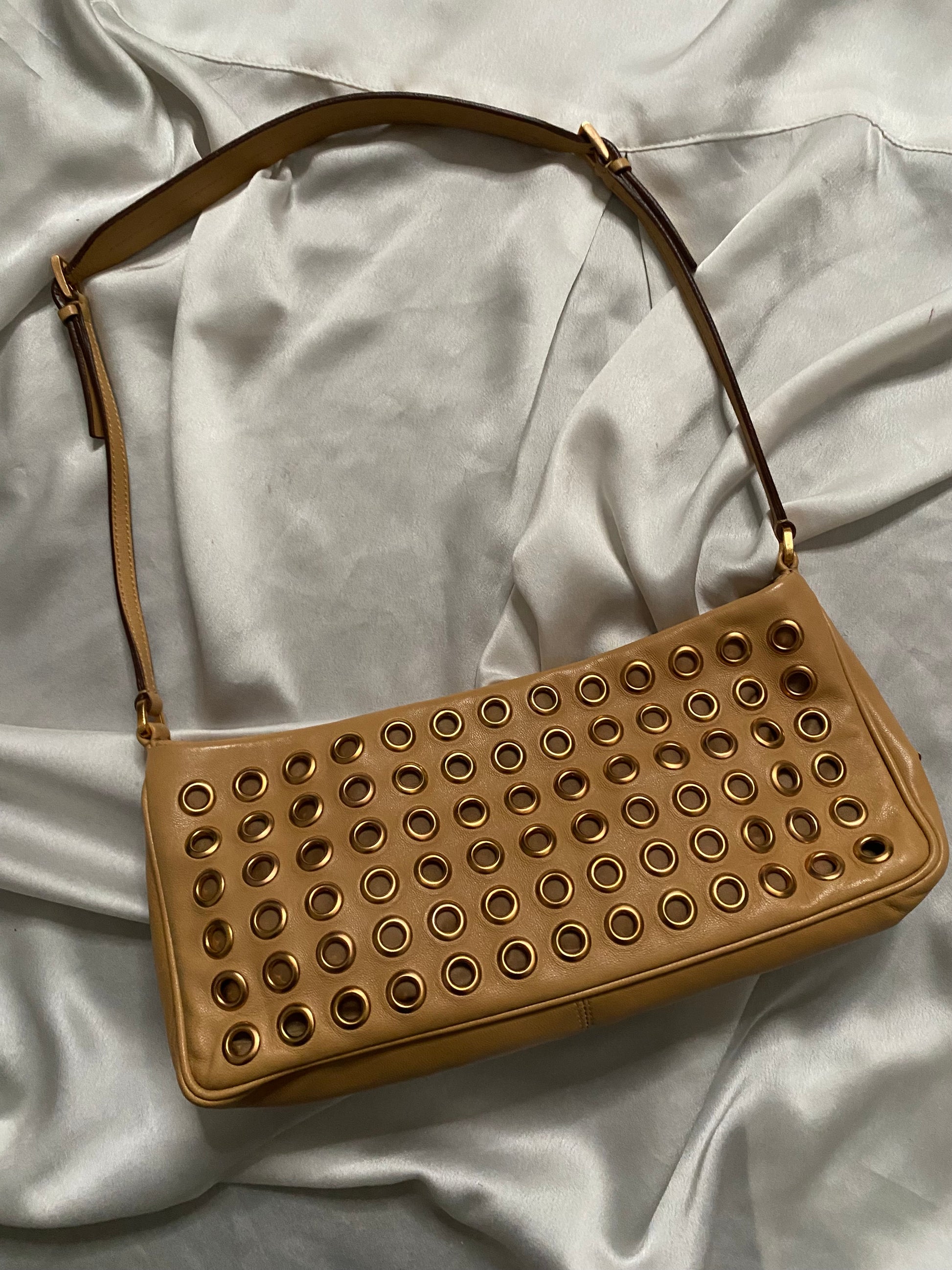 Prada camel clutch bag with studs