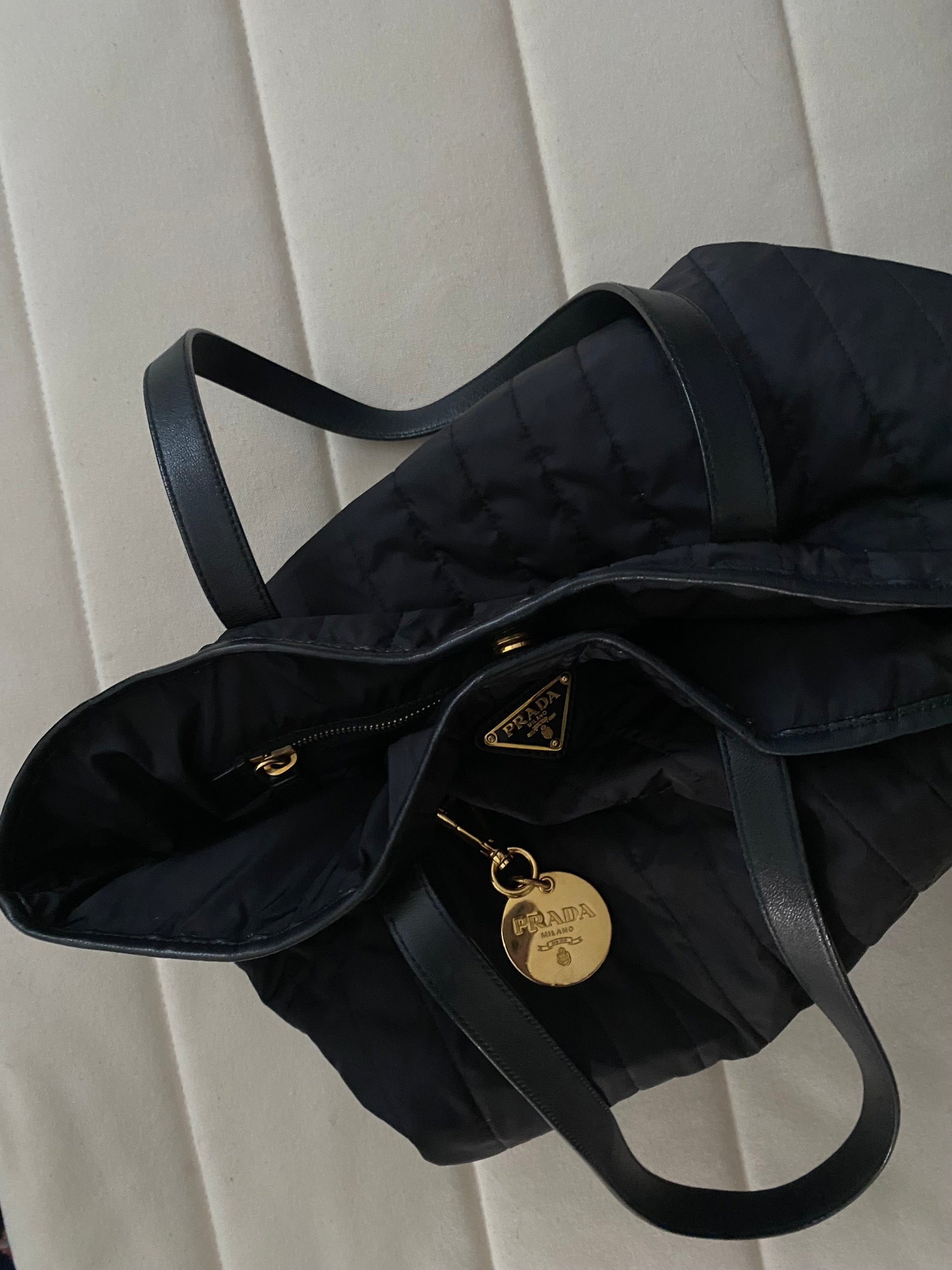 Fantastic Prada tote in super unique quilted nylon with charm ✨ excellent condition. It also fits a 13-inch MacBook 💻 perfect as a college and work bag.