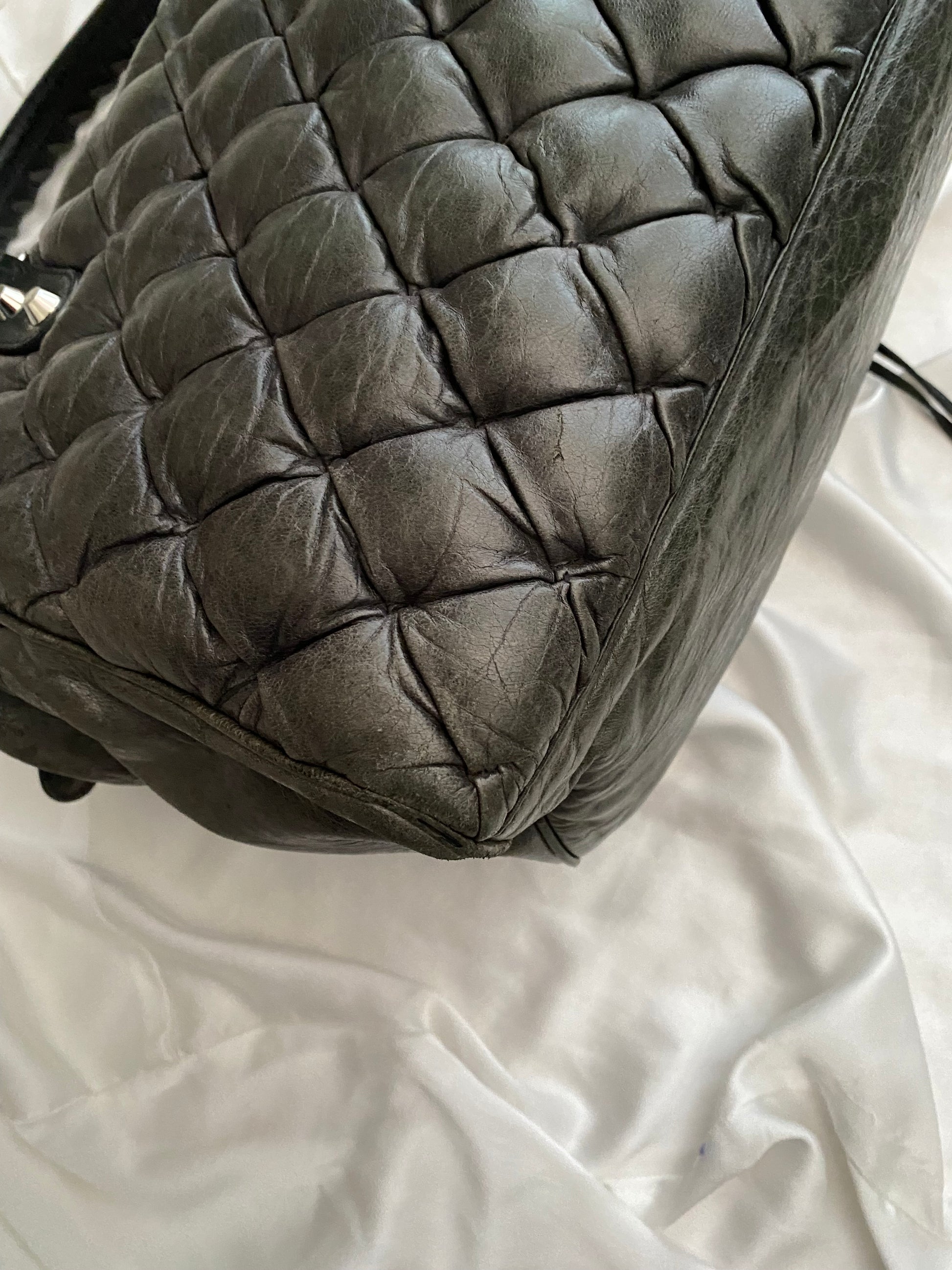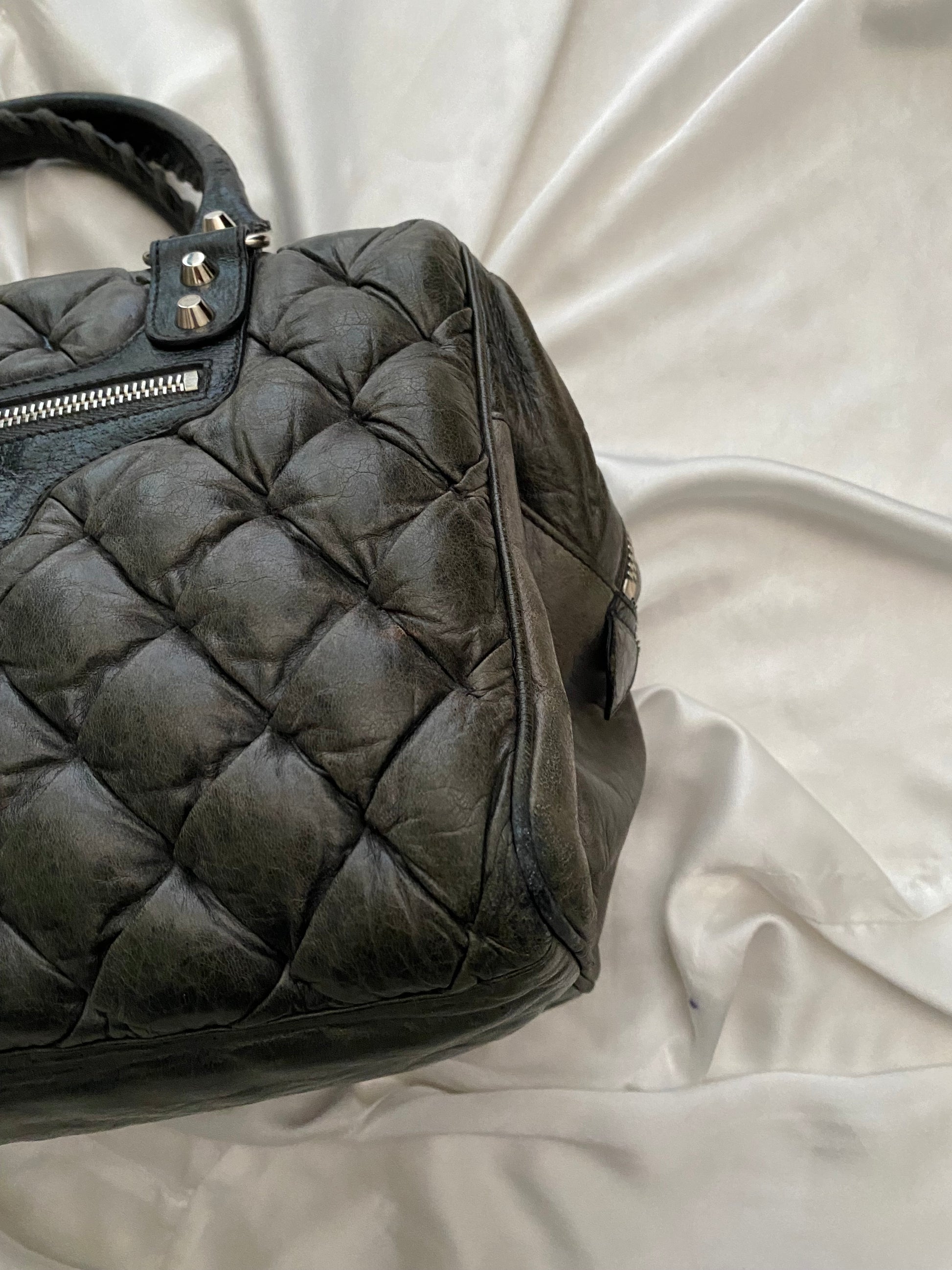 Iconica balenciaga city modello matelasse. Colore antracite ed effetto distressed unico. Alcuni difetti sugli angoli, per il resto fantastica. Disponibile anche il suo specchietto.