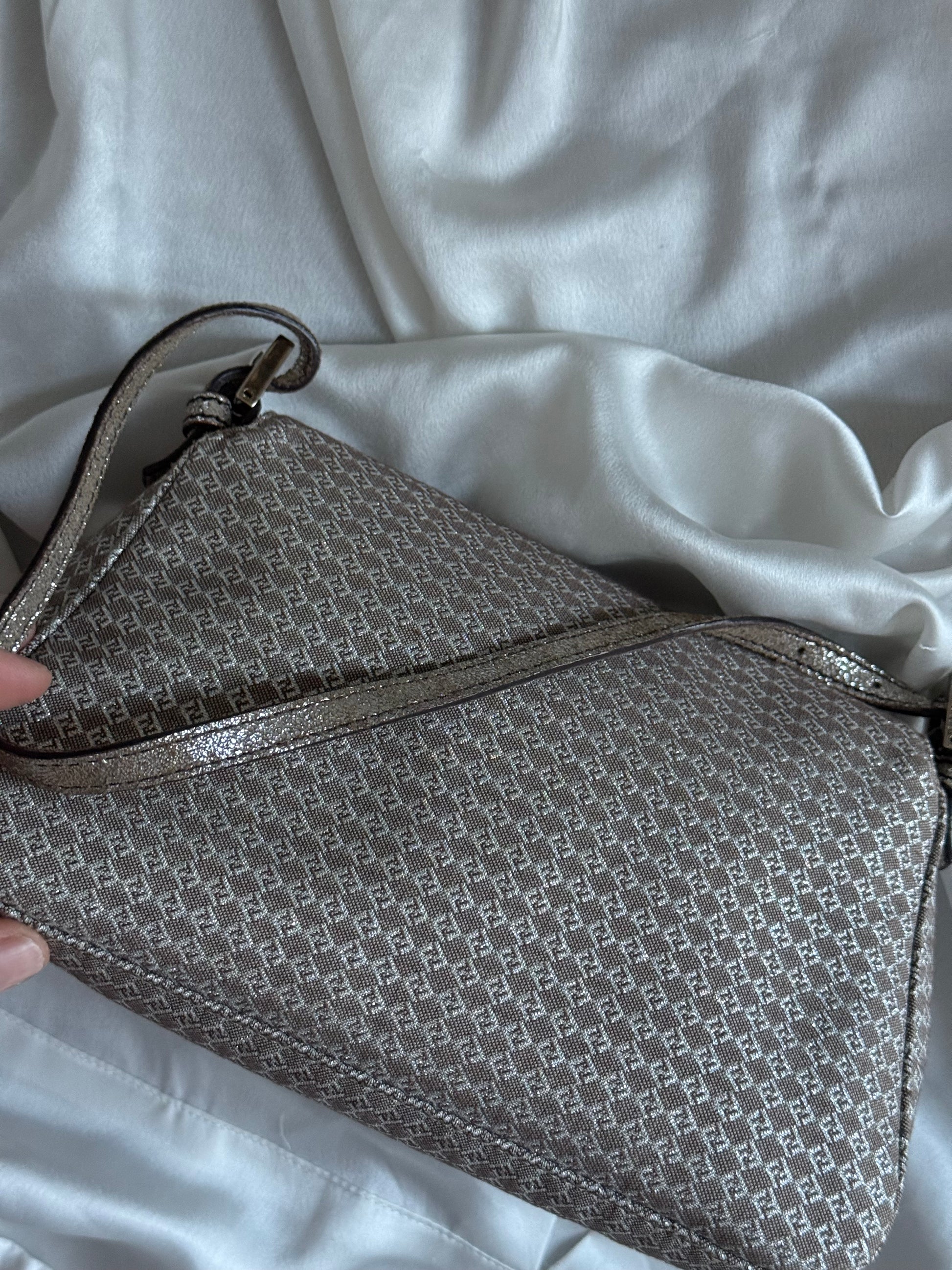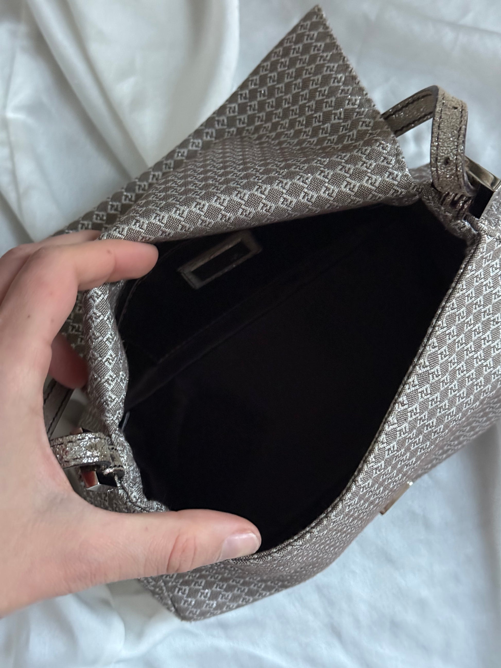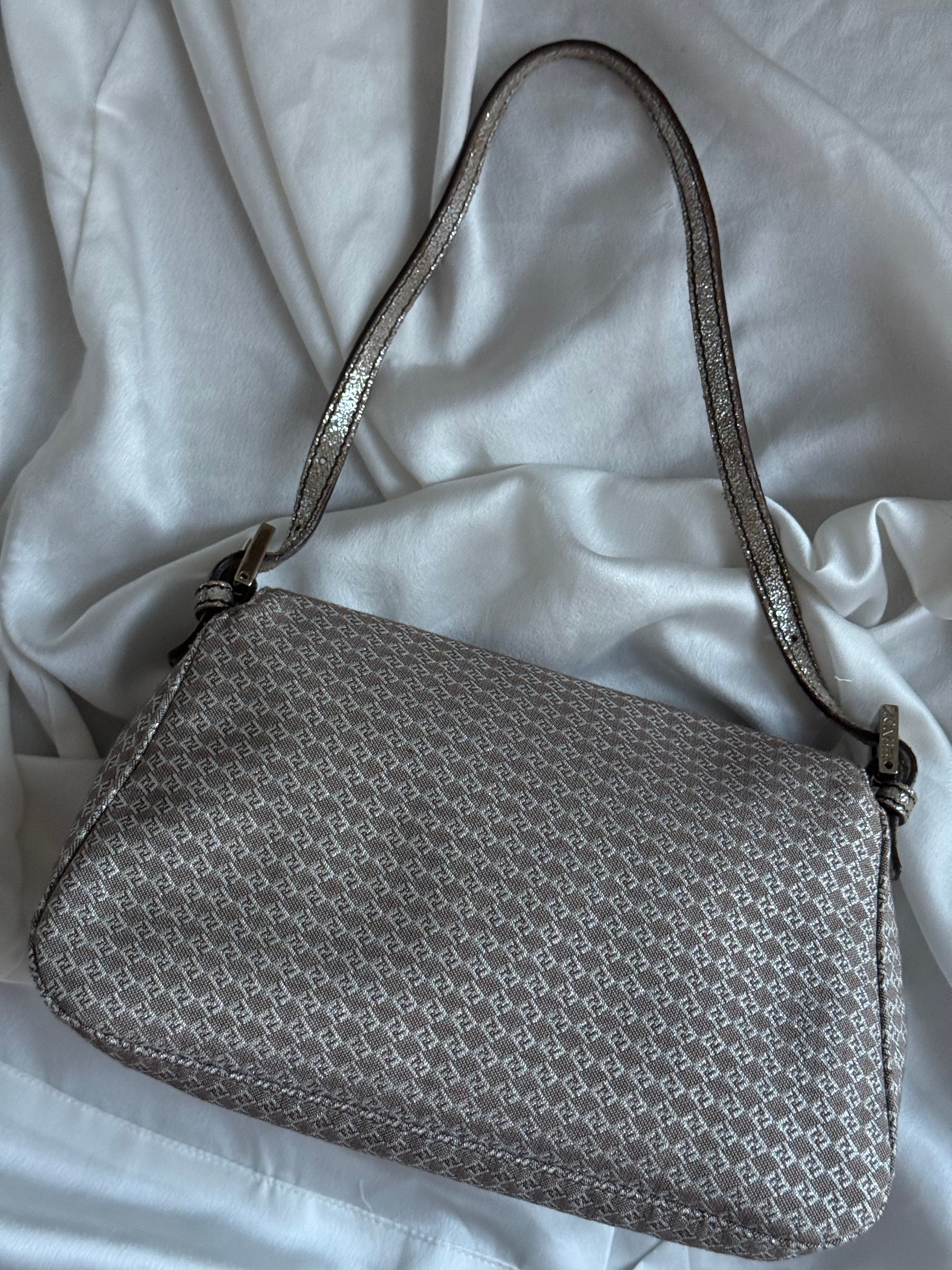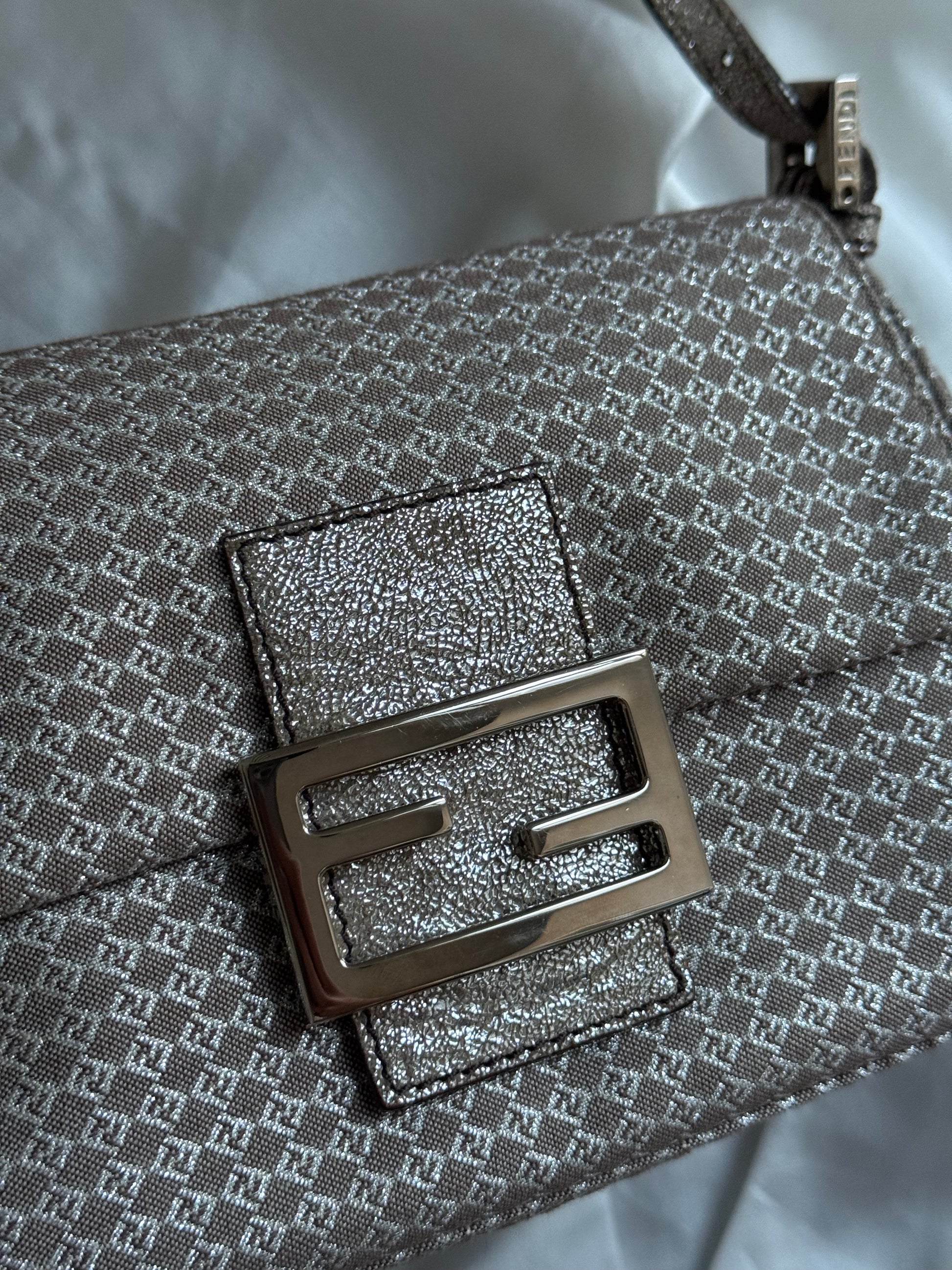Rarissima fendi baguette mini mamma in monogram argento brillante. Lievi segni sulla fibbia. Usata pochissimo e condizioni ottime.